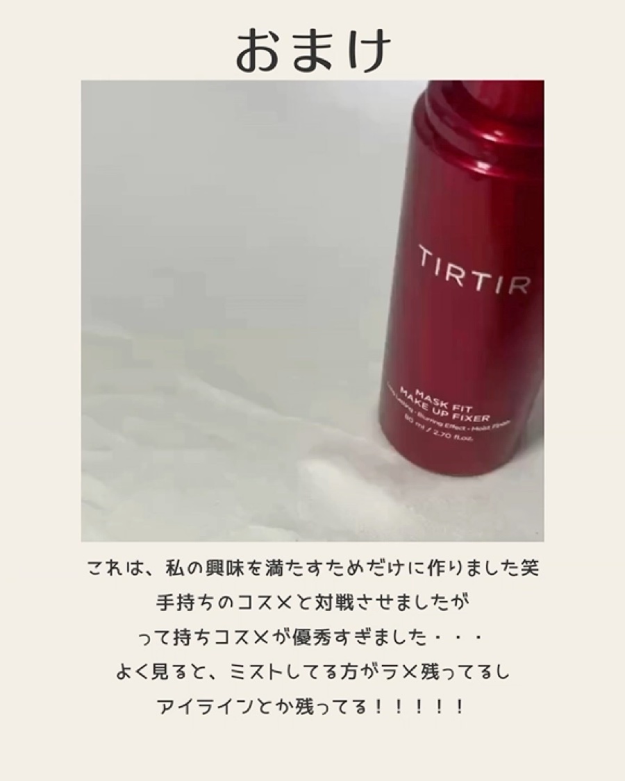 むーんぱわーさろんからいただきました🌙TIRTIR(ティルティル)マスクフィットメイクアップフィクサーこれまでいろんなメイクキープミストを使ってきましたが、これはかなりお気に入りの1本♡運動後の汗にも負けない…‼️本当に頼れるメイクキープミス...