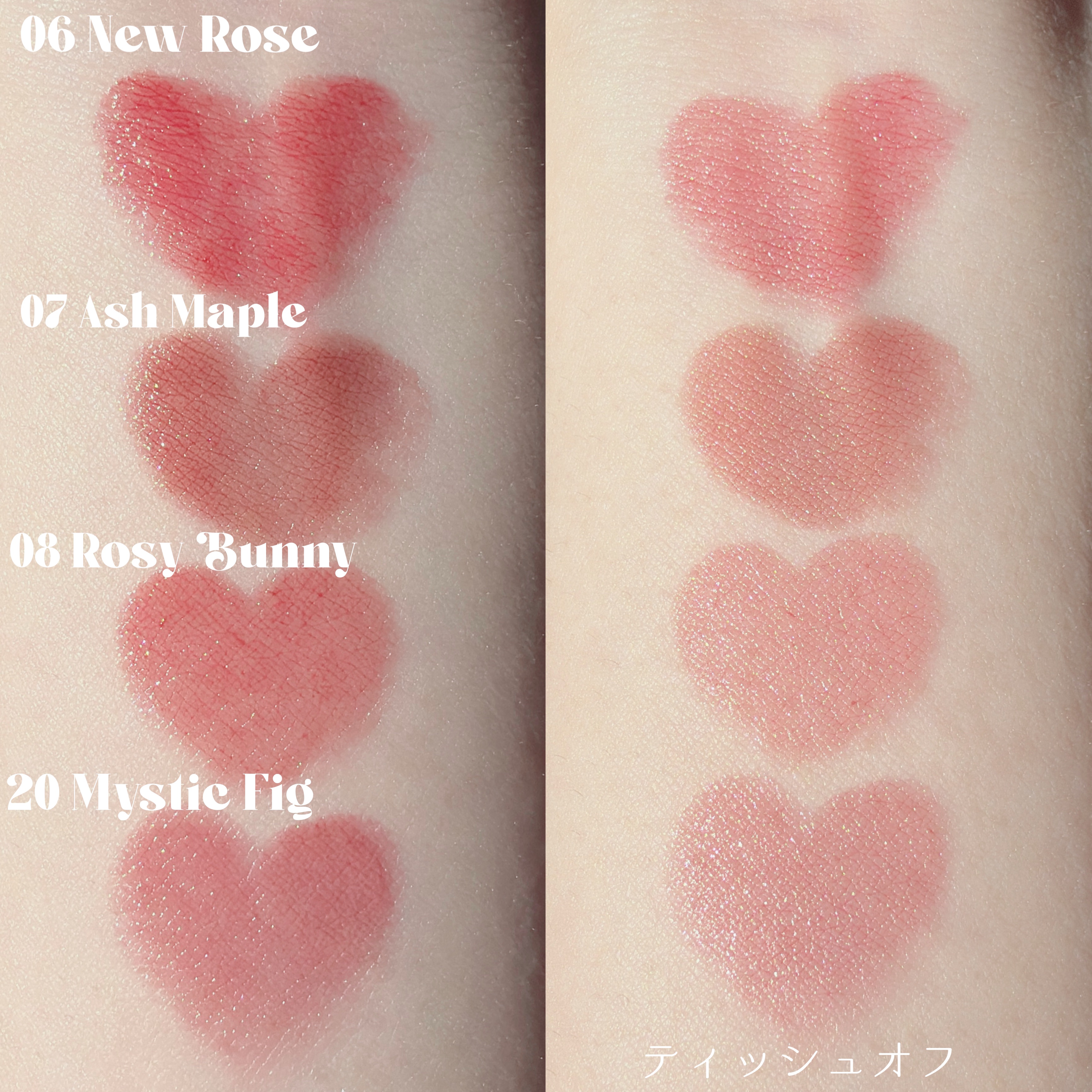 - <12 ピュアモモ【日本限定カラー】> ペンタイソステアリン酸ジペンタエリスリチル、トリ(カプリル酸/カプリン酸)グリセリル、ラウロイルグルタミン酸ジ(フィトステリル/オクチルドデシル)、オクチルドデカノール、グリセリルウンデシルジメチコン、ジフェニルジメチコン、合成ワックス、ダイマージリノール酸(フィトステリル/イソステアリル/セチル/ステアリル/ベヘニル)、トリイソステアリン酸ポリグリセリル-2、ラウリルポリグリセリル-3ポリジメチルシロキシエチルジメチコン、(アクリレーツ/アクリル酸ステアリル/メタクリル酸ジメチコン)コポリマー、ポリヒドロキシステアリン酸、(エチレン/プロピレン)コポリマー、ジメチコン、レシチン、香料、パルミチン酸エチルヘキシル、イソステアリン酸、ミリスチン酸イソプロピル、ポリリシノレイン酸ポリグリセリル-3、トリエトキシカプリリルシラン、水酸化Al、トコフェロール、酸化チタン、酸化鉄、赤202、黄4、赤201 <01 ヴィヴィディ【EC展開カラー】> ペンタイソステアリン酸ジペンタエリスリチル、トリ(カプリル酸/カプリン酸)グリセリル、ラウロイルグルタミン酸ジ(フィトステリル/オクチルドデシル)、オクチルドデカノール、グリセリルウンデシルジメチコン、ジフェニルジメチコン、合成ワックス、ダイマージリノール酸(フィトステリル/イソステアリル/セチル/ステアリル/ベヘニル)、トリイソステアリン酸ポリグリセリル-2、(アクリレーツ/アクリル酸ステアリル/メタクリル酸ジメチコン)コポリマー、ラウリルポリグリセリル-3ポリジメチルシロキシエチルジメチコン、(エチレン/プロピレン)コポリマー、ジメチコン、ポリヒドロキシステアリン酸、香料、レシチン、パルミチン酸エチルヘキシル、イソステアリン酸、ミリスチン酸イソプロピル、ポリリシノレイン酸ポリグリセリル-3、水酸化Al、トリエトキシカプリリルシラン、トコフェロール、赤226、黄5、赤104(1)、酸化チタン、赤201 <02 ベリーコア> ペンタイソステアリン酸ジペンタエリスリチル、トリ(カプリル酸/カプリン酸)グリセリル、オクチルドデカノール、ラウロイルグルタミン酸ジ(フィトステリル/オクチルドデシル)、グリセリルウンデシルジメチコン、ジフェニルジメチコン、合成ワックス、ダイマージリノール酸(フィトステリル/イソステアリル/セチル/ステアリル/ベヘニル)、トリイソステアリン酸ポリグリセリル-2、(アクリレーツ/アクリル酸ステアリル/メタクリル酸ジメチコン)コポリマー、ラウリルポリグリセリル-3ポリジメチルシロキシエチルジメチコン、(エチレン/プロピレン)コポリマー、ジメチコン、香料、トコフェロール、赤202、赤201、黄5、酸化鉄 <03 クランベリー【EC展開カラー】> ペンタイソステアリン酸ジペンタエリスリチル、オクチルドデカノール、トリ(カプリル酸/カプリン酸)グリセリル、ラウロイルグルタミン酸ジ(フィトステリル/オクチルドデシル)、グリセリルウンデシルジメチコン、ジフェニルジメチコン、合成ワックス、ダイマージリノール酸(フィトステリル/イソステアリル/セチル/ステアリル/ベヘニル)、トリイソステアリン酸ポリグリセリル-2、(アクリレーツ/アクリル酸ステアリル/メタクリル酸ジメチコン)コポリマー、ラウリルポリグリセリル-3ポリジメチルシロキシエチルジメチコン、(エチレン/プロピレン)コポリマー、ジメチコン、香料、リンゴ酸ジイソステアリル、トコフェロール、ポリヒドロキシステアリン酸、レシチン、トリエトキシカプリリルシラン、パルミチン酸エチルヘキシル、イソステアリン酸、ミリスチン酸イソプロピル、ポリリシノレイン酸ポリグリセリル-3、酸化鉄、黄5、赤202、赤230(1) <04 ヘイベスティ【EC展開カラー】> ペンタイソステアリン酸ジペンタエリスリチル、トリ(カプリル酸/カプリン酸)グリセリル、ラウロイルグルタミン酸ジ(フィトステリル/オクチルドデシル)、オクチルドデカノール、ジフェニルジメチコン、グリセリルウンデシルジメチコン、合成ワックス、ダイマージリノール酸(フィトステリル/イソステアリル/セチル/ステアリル/ベヘニル)、トリイソステアリン酸ポリグリセリル-2、ラウリルポリグリセリル-3ポリジメチルシロキシエチルジメチコン、(アクリレーツ/アクリル酸ステアリル/メタクリル酸ジメチコン)コポリマー、ポリヒドロキシステアリン酸、(エチレン/プロピレン)コポリマー、ジメチコン、レシチン、香料、パルミチン酸エチルヘキシル、イソステアリン酸、ミリスチン酸イソプロピル、ポリリシノレイン酸ポリグリセリル-3、水酸化Al、トリエトキシカプリリルシラン、トコフェロール、酸化チタン、赤202、黄5、赤104(1)、酸化鉄、青1 <05 ブルーベリー> ペンタイソステアリン酸ジペンタエリスリチル、トリ(カプリル酸/カプリン酸)グリセリル、ラウロイルグルタミン酸ジ(フィトステリル/オクチルドデシル)、オクチルドデカノール、グリセリルウンデシルジメチコン、ジフェニルジメチコン、合