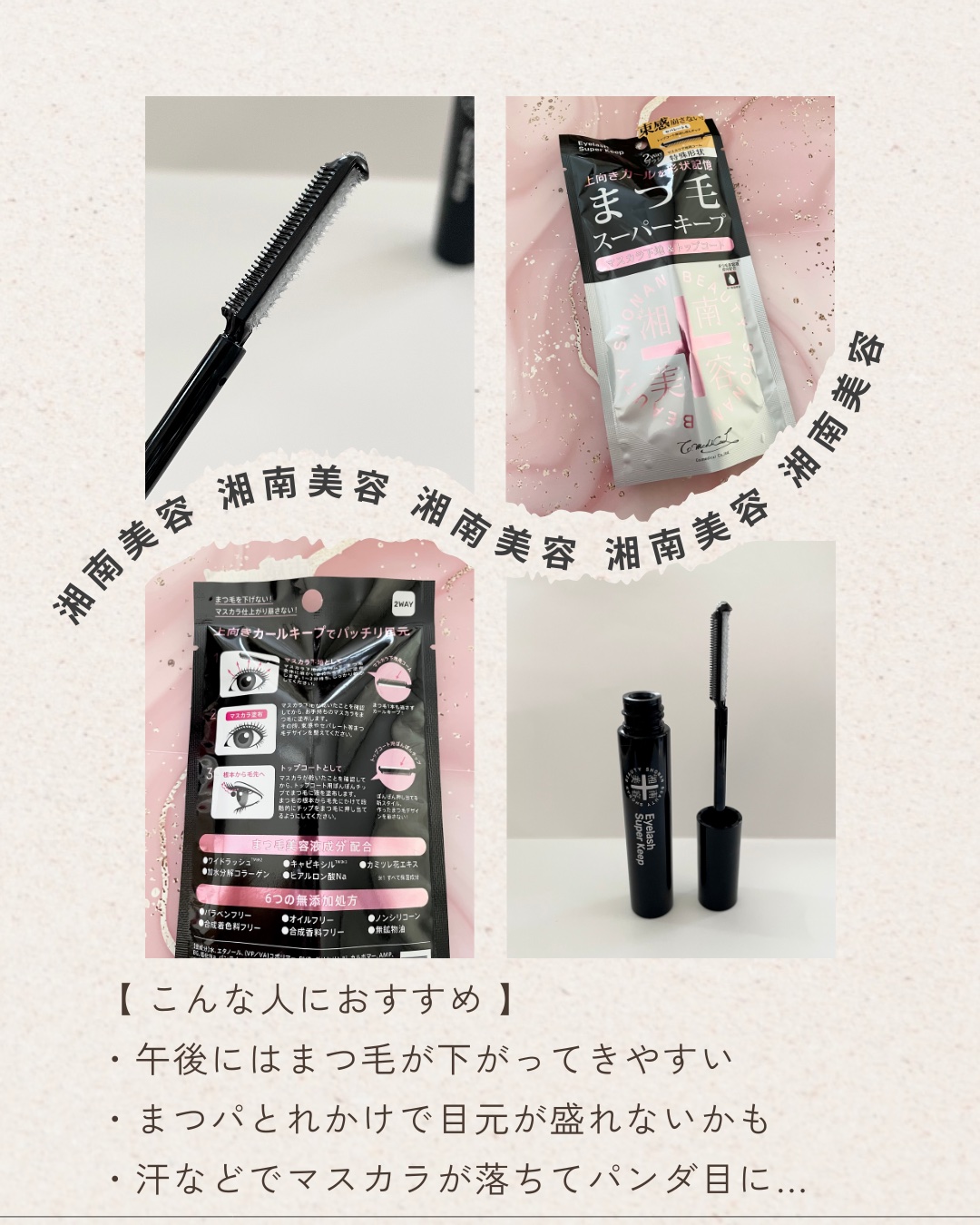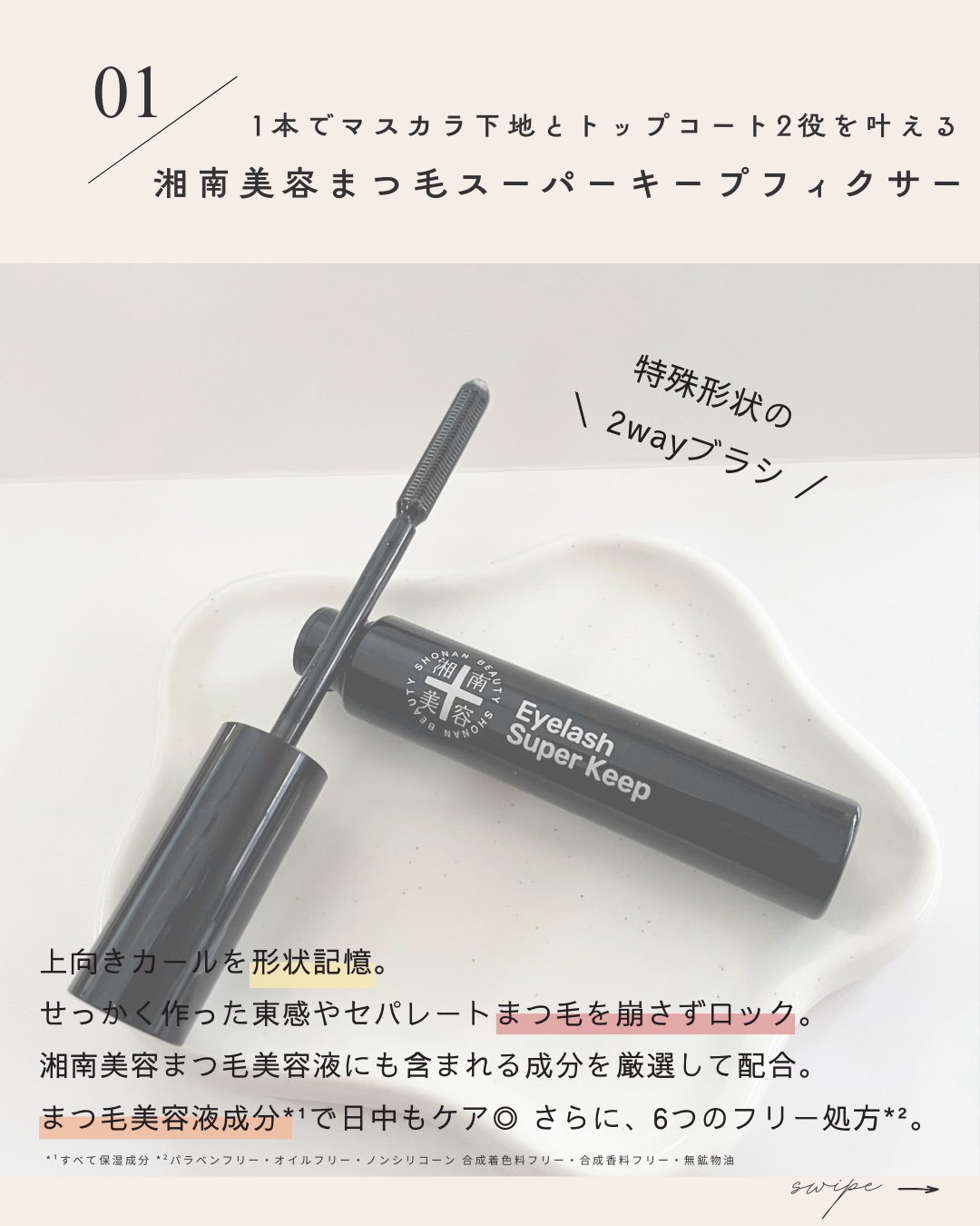 - まつ毛美容液No.1*の湘南美容シリーズから、“まつ毛キープ剤”が誕生。 カールをキープするのはもちろん、マスカラ使用時に作った束感やセパレートなどのまつ毛デザインを崩さずに、まつ毛をキープ&ホールドすることができます。 コームとチップが一体になった特殊形状2wayカールブラシが特徴的で、マスカラ下地としてもトップコートとしてもお使いいただけます。 *湘南美容シリーズ内売上 ① 特殊形状2wayカールブラシ 作ったまつ毛の束感、セパレートまつ毛を崩さないように、特殊形状ブラシを採用しています。 まつ毛デザインを崩さず、夜までメイク仕立ての美まつ毛をキープ。 ②マスカラ下地&トップコートを1本で 上向きカールを形状記憶する“まつ毛キープ剤”をマスカラ下地とトップコートのダブル使いすることでメイク仕立ての仕上がりを強力キープ。マスカラの色を邪魔をしない透明色。まつ毛のカールを下げずに、マスカラもにじませません。 ③ まつ毛美容液成分で日中もケア 同シリーズの人気商品「湘南美容まつ毛美容液」にも含まれる成分を厳選して配合しています。6つのフリー処方で目元にやさしい設計です。 【12月末〜1月初旬より順次販売開始】 全国のバラエティショップ・ドラッグストア・ショッピングセンターなど