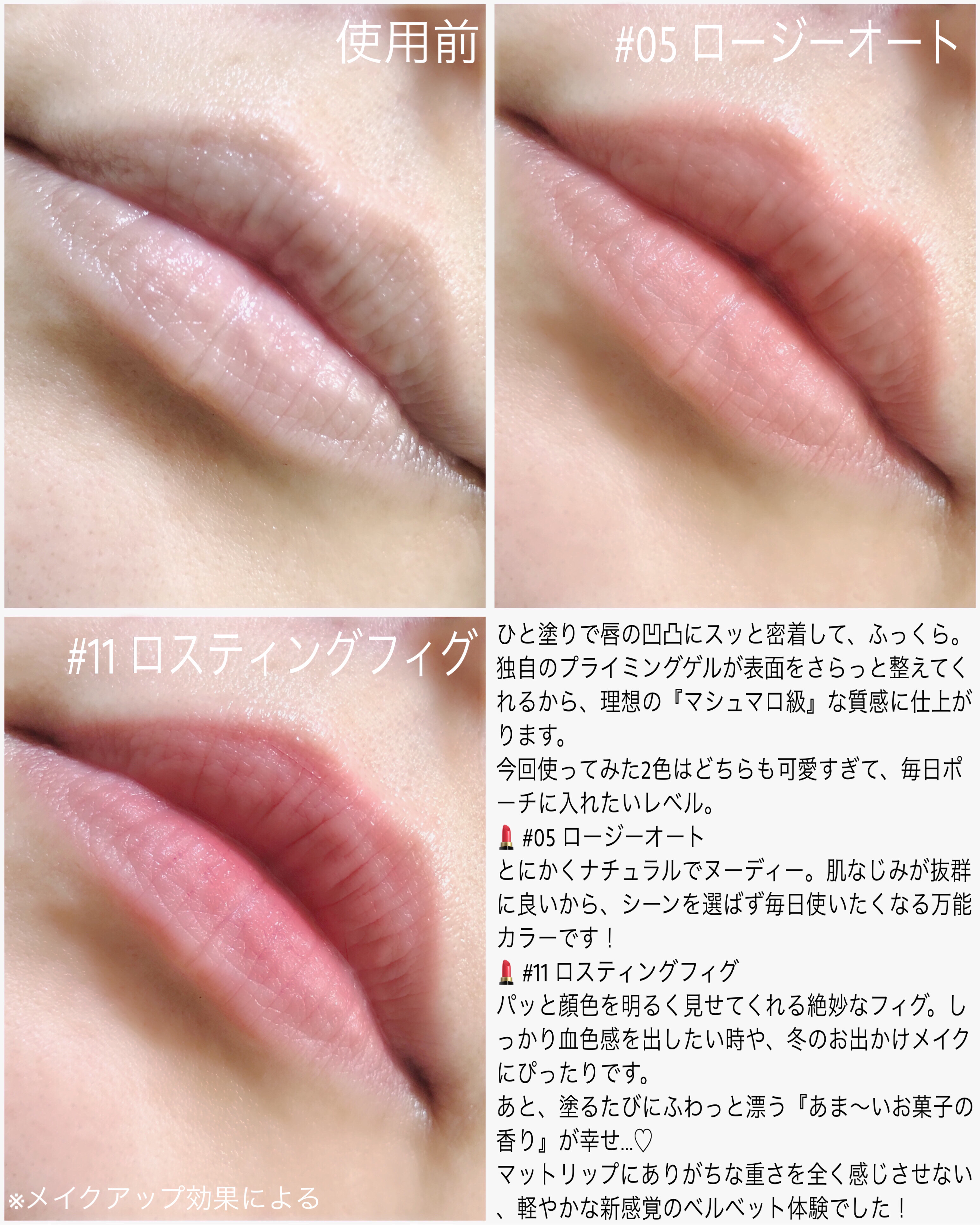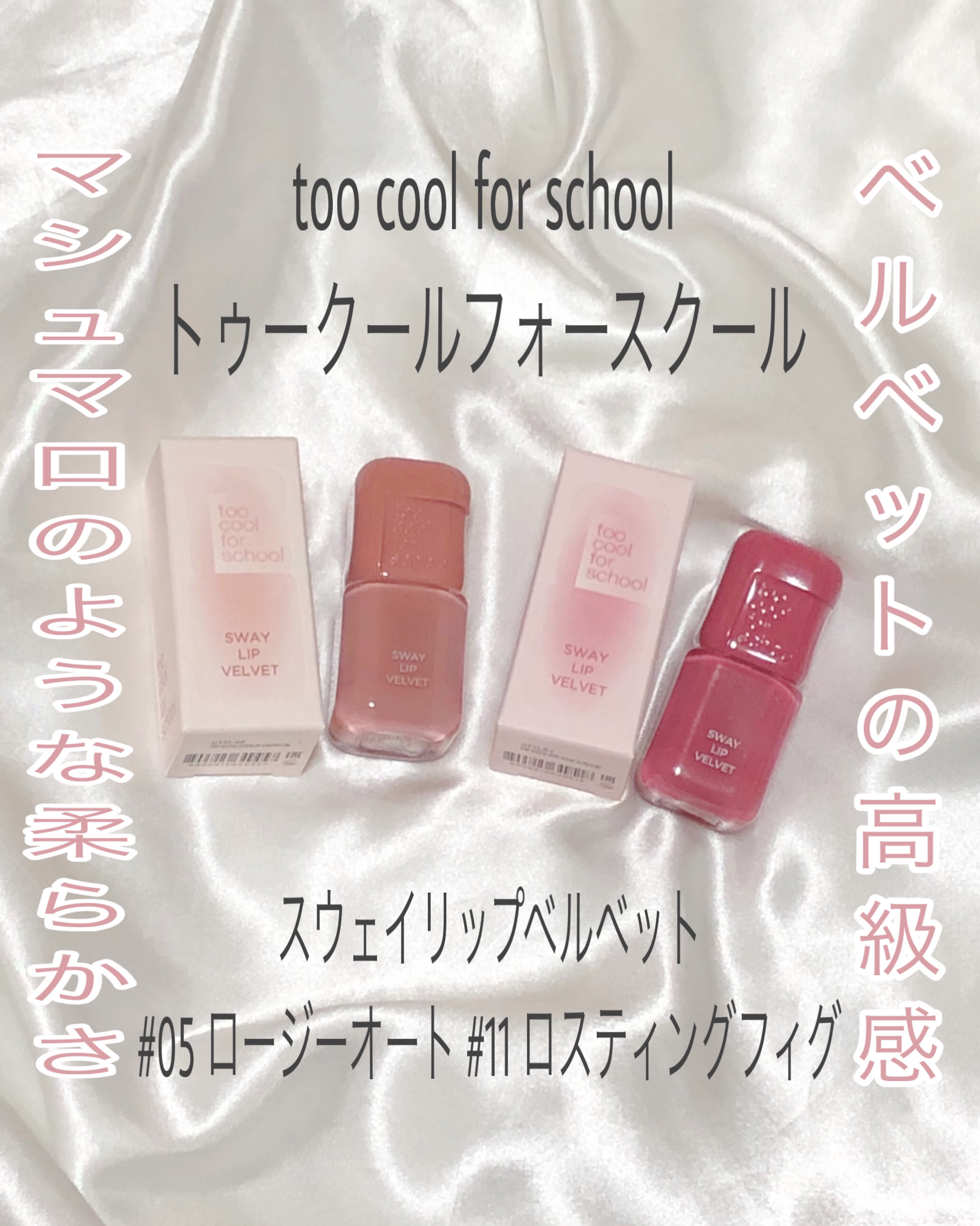 ふんわりとしたスフレマットな仕上がりのtoocoolforschoolのスウェイリップベルベット💄唇のしわを埋めるプライミングゲル入りで、乾燥や縦じわを感じにくかったよ◎5番のロージーオートはニュートラルな色味で使いやすく可愛い!11番のロス...