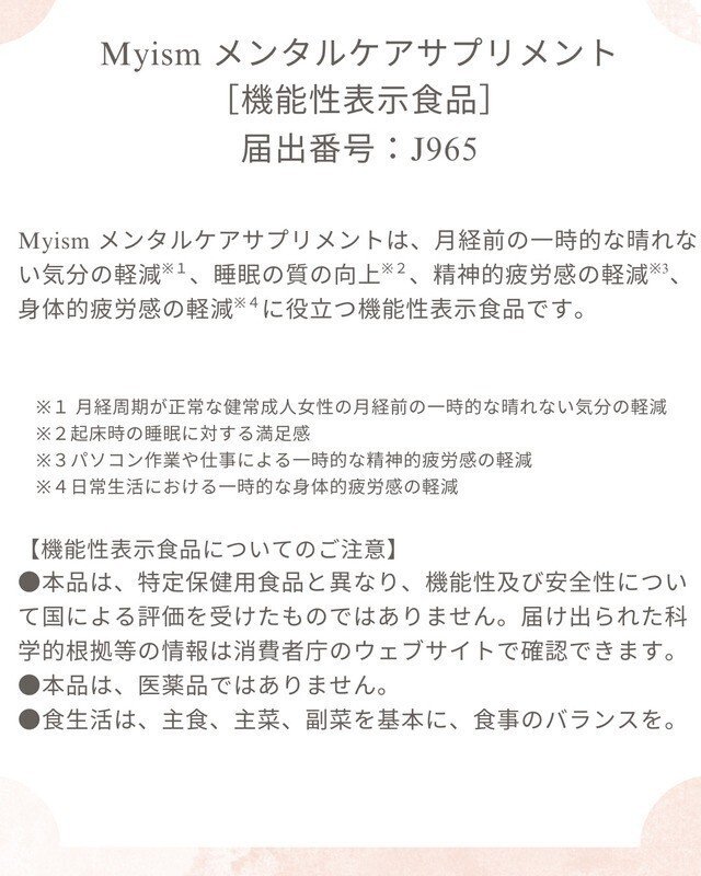 - 「Myism メンタルケアサプリメント」は、月経前の一時的な晴れない気分の軽減※1、睡眠の質※2の向上、精神的疲労感の軽減※3、身体的疲労感の軽減※4に役立つ機能性表示食品です。機能性表示食品の関与成分として初の組み合わせ※5である、ラフマ由来ヒペロシド、ラフマ由来イソクエルシトリン、S-アリルシステインの3成分を配合しています。また、機能性関与成分の他にも、はぴねす乳酸菌®を2粒(1日摂取目安量)あたり10億個配合しています。 本商品は、月経前などの必要なときにだけ摂取したいというニーズに合わせて、7回分(14粒入)と15回分(30粒入)の2タイプを展開します。続けやすい錠剤タイプのサプリメントで、香りには、20代女性に人気の高かった「チョコレートの香り」を採用。気分を落ち着かせる香りで、リラックス時間をサポートします。パッケージデザインには、中心に印象的な楕円形のモチーフを配置し、グラデーションカラーでメンタルが明るく前向きに整っていく様子を表現しました。また、女性活躍推進企業として佐藤薬品が一昨年認定取得した、「えるぼし認定」マークをパッケージ裏面に記載しています。佐藤薬品工業は、今後もライフスタイルに寄り添った商品開発を通じて、心身の健康維持をサポートしていきます。 ※1 月経周期が正常な健常成人女性の月経前の一時的な晴れない気分の軽減 ※2 起床時の睡眠に対する満足感 ※3 パソコン作業や仕事による一時的な精神的疲労感の軽減 ※4 日常生活における一時的な身体的疲労感の軽減 ※5 自社調べ(2025年10月1日時点)