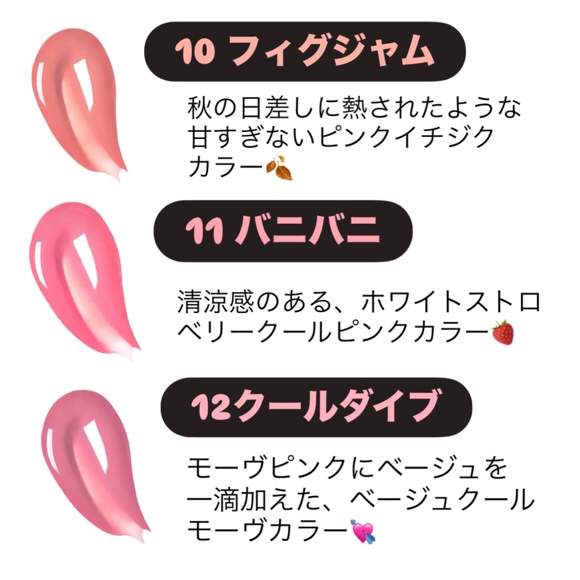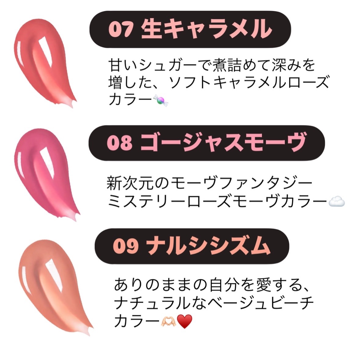 - <01 モモジェリー> Water、Diphenyl Dimethicone、Diisostearyl Malate、Bis-Diglyceryl Polyacyladipate-2、Hydrogenated Polyisobutene、Bis-Behenyl/Isostearyl/Phytosteryl Dimer Dilinoleyl Dimer Dilinoleate、Cetyl PEG/PPG-10/1 Dimethicone、Diglycerin、Hydrogenated Polydecene、Dipropylene Glycol、Polysorbate 60、Sorbitan Isostearate、Hydroxyethyl Acrylate/Sodium Acryloyldimethyl Taurate Copolymer、Pentylene Glycol、Squalane、Titanium Dioxide (CI 77891)、Ethylene/Propylene Copolymer、Ceteareth-20、Phenoxyethanol、Polyglycerin-3、Yellow 5 (CI 19140)、Red 33 (CI 17200)、Fragrance、Ethylhexylglycerin、Glycerin、Aluminum Hydroxide、Ammonium Polyacrylate、Yellow 6 (CI 15985)、Butylene Glycol、Blue 1 (CI 42090)、Tocopheryl Acetate、Prunus Persica (Peach) Fruit Extract、1,2-Hexanediol、Sodium Hyaluronate、Hydroxypropyltrimonium Hyaluronate、Sodium Acetylated Hyaluronate、Hydrolyzed Hyaluronic acid、Hyaluronic Acid、Sodium Hyaluronate Crosspolymer、Hydrolyzed Sodium Hyaluronate、Potassium Hyaluronate <02 ヘルシーサーモン> Water、Diphenyl Dimethicone、Diisostearyl Malate、Bis-Diglyceryl Polyacyladipate-2、Hydrogenated Polyisobutene、Bis-Behenyl/Isostearyl/Phytosteryl Dimer Dilinoleyl Dimer Dilinoleate、Cetyl PEG/PPG-10/1 Dimethicone、Diglycerin、Hydrogenated Polydecene、Dipropylene Glycol、Polysorbate 60、Sorbitan Isostearate、Hydroxyethyl Acrylate/Sodium Acryloyldimethyl Taurate Copolymer、Pentylene Glycol、Squalane、Ethylene/Propylene Copolymer、Ceteareth-20、Phenoxyethanol、Titanium Dioxide (CI 77891)、Polyglycerin-3、Yellow 6 (CI 15985)、Fragrance、Ethylhexylglycerin、Red 33 (CI 17200)、Glycerin、Red 28 (CI 45410)、Aluminum Hydroxide、Ammonium Polyacrylate、Yellow 5 (CI 19140)、Butylene Glycol、Tocopheryl Acetate、Blue 1 (CI 42090)、Prunus Persica (Peach) Fruit Extract、1,2-Hexanediol、Sodium Hyaluronate、Hydroxypropyltrimonium Hyaluronate、Sodium Acetylated Hyaluronate、Hydrolyzed Hyaluronic acid、Hyaluronic Acid、Sodium Hyaluronate Crosspolymer、Hydrolyzed Sodium Hyaluronate、Potassium Hyaluronate <03 ヌーディーピンク> Water、Diphenyl Dimethicone、Diisostearyl Malate、Bis-Diglyceryl Polyacyladipate-2、Hydrogenated Polyisobutene、Bis-Behenyl/Isostearyl/Phytosteryl Dimer Dilinoleyl Dimer Dilinoleate、Cetyl PEG/PPG-10/1 Dimethicone、Diglycerin、Hydrogenated Polydecene、Dipropylene Glycol、Polysorbate 60、Sorbitan Isostearate、Hydroxyethyl Acrylate/Sodium Acryloyldimethyl Taurate Copolymer、Pentylene Glycol、Squalane、Ethylene/Propylene Copolymer、Ceteareth-20、Titanium Dioxide (CI 77891)、Phenoxyethanol、Polyglycerin-3、Red 33 (CI 17200)、Yellow 5 (CI 19140)、Fragrance、Ethylhexylglycerin、Glycerin、Aluminum Hydroxide、Ammonium Polyacrylate、Butylene Glycol、Blue 1 (CI 42090)、Tocopheryl Acetate、Prunus Persica (Peach) Fruit Extract、1,2-Hexanediol、Sodium Hyaluronate、Hydroxypropyltrimonium Hyaluronate、Sodium Acetylated Hyaluronate、Hydrolyzed Hyaluronic acid、Hyaluronic Acid、Sodium Hyaluronate Crosspolymer、Hydrolyzed Sodium Hyaluronate、Potassium Hyaluronate <04 ローズミルク> Water、Diphenyl Dimethicone、Diisostearyl Malate、Bis-Diglyceryl Polyacyladipate-2、Hydrogenated Polyisobutene、Bis-Behenyl/Isostearyl/Phytosteryl Dimer Dilinoleyl Dimer Dilinoleate、Cetyl PEG/PPG-10/1 Dimethicone、Diglycerin、Hydrogenated Polydecene、Dipropylene Glycol、Polysorbate 60、Sorbitan Isostearate、Hydroxyethyl Acrylate/Sodium Acryloyldimethyl Taurate Copolymer、Pentylene Glycol、Squalane、Ethylene/Propylene Copolymer、Ceteareth-20、Titanium Dioxide (CI 77891)、Phenoxyethanol、Polyglycerin-3、Red 28 (CI 45410)、Yellow 6 (CI 15985)、Fragrance、Ethylhexylglycerin、Red 33 (CI 17200)、Glycerin、Aluminum Hydroxide、Ammonium Polyacrylate、Butylene Glycol、Blue 1 (CI 42090)、Tocopheryl Acetate、Prunus Persica (Peach) Fruit Extract、1,2-Hexanediol、Sodium Hyaluronate、Hydroxypropyltrimonium Hyaluronate、Sodium Acetylated Hyaluronate、Hydrolyzed Hyaluronic acid、Hyaluronic Acid、Sodium Hyaluronate Crosspolymer、Hydrolyzed Sodium Hyaluronate、Potassium Hyaluronate <05 ベージュフィグ> Water、Diphenyl Dimethicone、Diisostearyl Malate、Bis-Diglyceryl Polyacyladipate-2、Hydrogenated Polyisobutene、Bis-Behenyl/Isostearyl/Phytosteryl Dimer Dilinoleyl Dimer Dilinoleate、Cetyl PEG/PPG-10/1 Dimethicone、Diglycerin、Hydrogenated Polydecene、Dipropylene Glycol、Polysorbate 60、Sorbitan Isostearate、Hydroxyethyl Acrylate/Sodium Acryloyldimethyl Taurate Copolymer、Pentylene Glycol、Squalane、Titanium Dioxide (CI 77891)、Ethylene/Propylene Copolymer、Ceteareth-20、Phenoxyethanol、Polyglycerin-3、Yellow 5 (CI 19140)、Red 33 (CI 17200)、Fragrance、Ethylhexylglycerin、Yellow 6 (CI 15985)、Glycerin、Aluminum Hydroxide、Ammonium Polyacrylate、Butylene Glycol、Blue 1 (CI 42090)、Tocopheryl Acetate、Prunus Persica (Peach) Fruit Extract、1,2-Hexanediol、Sodium Hyaluronate、Hydroxypropyltrimonium Hyaluronate、Sodium Acetylated Hyaluronate、Hydrolyzed Hyaluronic acid、Hyaluronic Acid、Sodium Hyaluronate Crosspolymer、Hydrolyzed Sodium Hyaluronate、Potassium Hyaluronate <06 ソウルガール> Water、Diphenyl Dimethicone、Diisostearyl Malate、Bis-Diglyceryl Polyacyladipate-2、Hydrogenated Polyisobutene、Bis-Behenyl/Isostearyl/Phytosteryl Dimer Dilinoleyl Dimer Dilinoleate、Cetyl PEG/PPG-10/1 Dimethicone、Diglycerin、Hydrogenated Polydecene、Dipropylene Glycol、Polysorbate 60、Sorbitan Isostearate、Hydroxyethyl Acrylate/Sodium Acryloyldimethyl Taurate Copolymer、Pentylene Glycol、Squalane、Ethylene/Propylene Copolymer、Ceteareth-20、Titanium Dioxide (CI 77891)、Phenoxyethanol、Polyglycerin-3、Red 33 (CI 17200)、Yellow 6 (CI 15985)、Fragrance、Ethylhexylglycerin、Yellow 5 (CI 19140)、Glycerin、Aluminum Hydroxide、Ammonium Polyacrylate、Blue 1 (CI 42090)、Butylene Glycol、Tocopheryl Acetate
