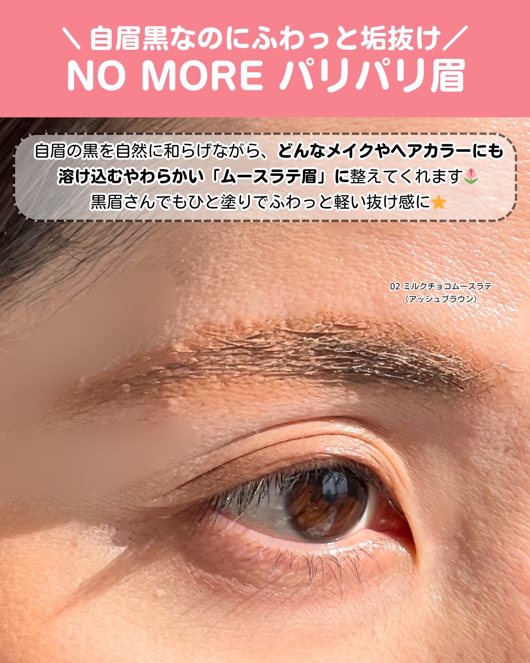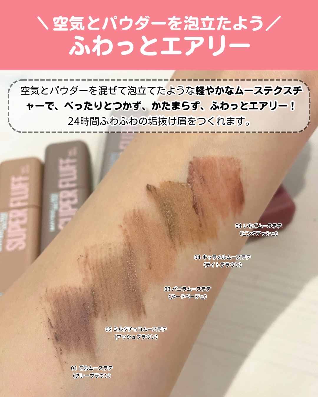 - \NO MORE パリパリ眉!/ 1日*ずっと、ほわっふわ眉。ムラなく色づき、黒眉ミュート ★商品特徴 ①エアリームーステクスチャー 空気とパウダーを混ぜて泡立てたような、軽やかなホイップムーステクスチャーだから、 べったりつかず、固くならない。ふわふわ仕上がり24時間*つづく。 ②テク要らずミニブラシ 先端に向かって細くなるブラシが、細かい毛も余さずキャッチするから、眉頭から眉尻まで均一にムラなく塗れる。 ③全5色展開 なりたい印象に合わせて選べる5色展開。 自眉の黒を消して存在感を抑えたい方にも、髪色に合わせた自然な眉にしたい方にも。 ★カラー展開 -ピンクアッシュ :いちごムースラテ -ライトブラウン :キャラメルムースラテ -ヌードベージュ :バニラムースラテ -アッシュブラウン:ミルクチョコムースラテ -グレーブラウン :ごまムースラテ * メイベリンニューヨーク調べ。個人差があります。