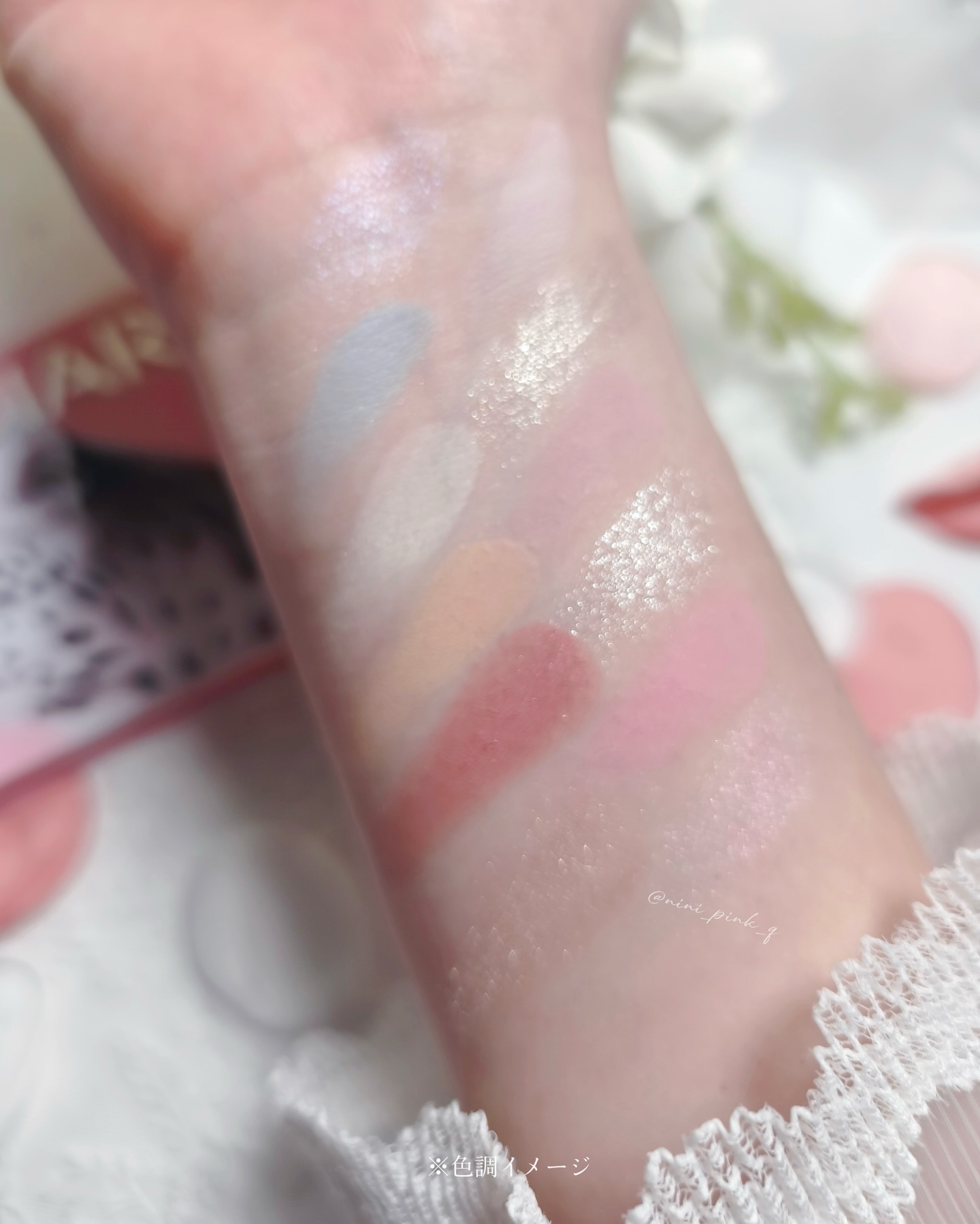 10 in flowはまさに夜桜パレット 深い夜空の月明かりで反射した川に 淡い桜の花びらが浮かんでるような。 儚くてエモい雰囲気。 ピンクのくすみがそこまで強くないから 意外と沈みにくいパレット。