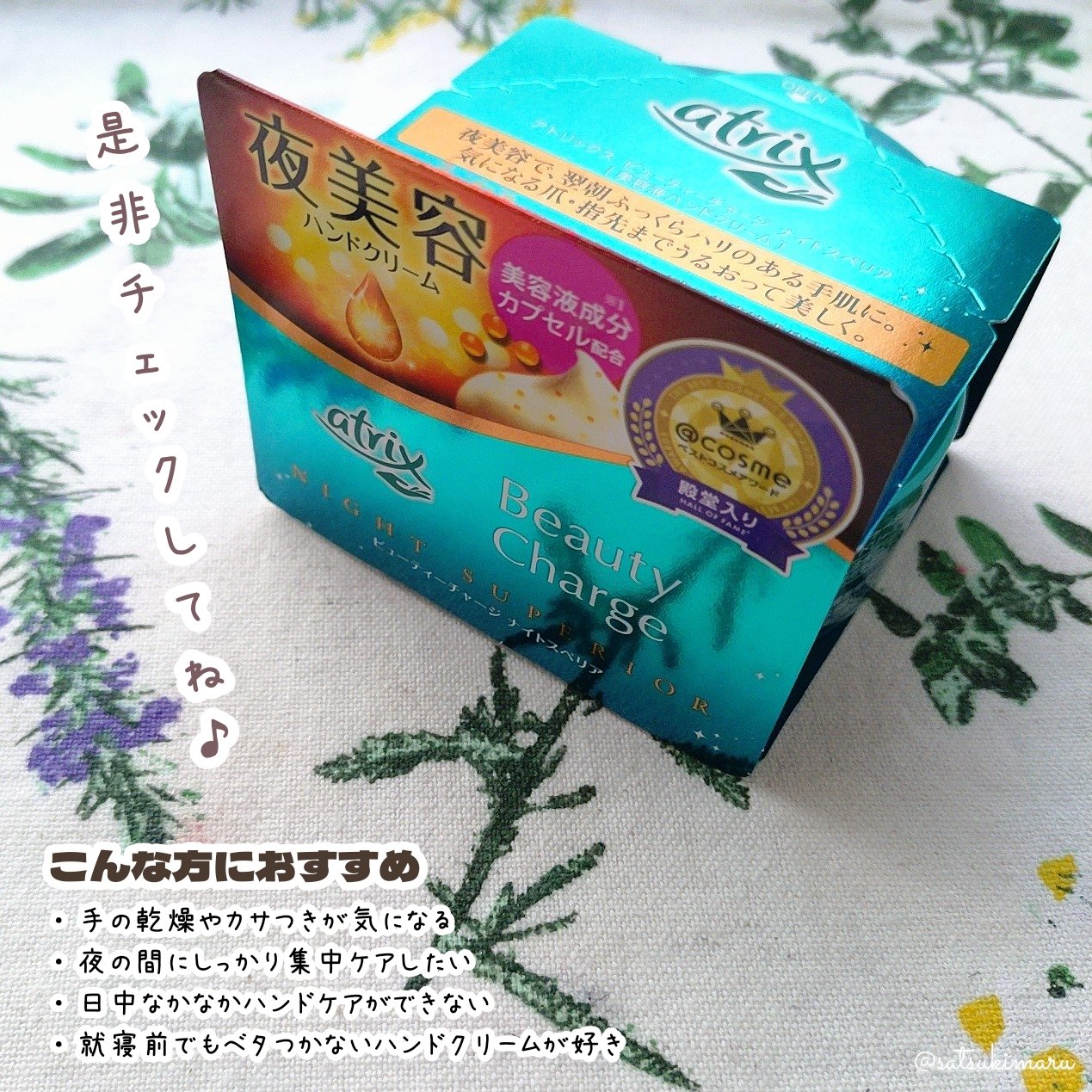 みち😼です。💖リピ買い💖【アトリックス】ビューティーチャージナイトスペリア✔︎ローヤルゼリー&パンテノールカプセル配合✔︎夜に使用するハンドクリーム⇢寝ている間にじっくり角層に浸透!翌朝ふっくらうるおったハリのある手肌に。✔︎ドリーミー...