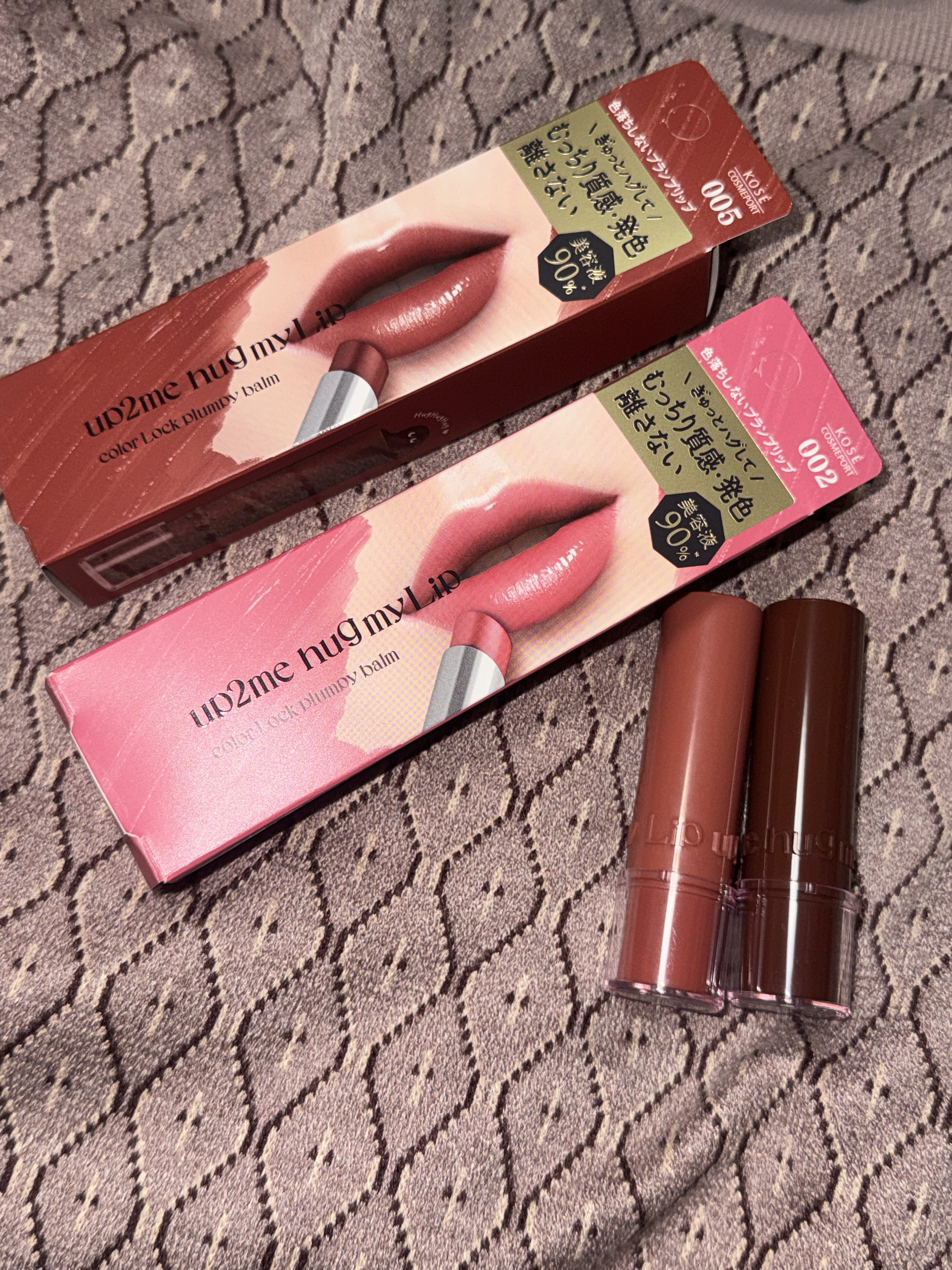 up2meさまからいただきましたup2mehugmyLipカラーロックプランピーバーム002ピクシーチャーム005シネマヒロインむっちり質感・発色ぎゅっとハグして離さない・色落ちしないジェル膜処方・ぽってりプランプ*1・生つやキープオイル配合...