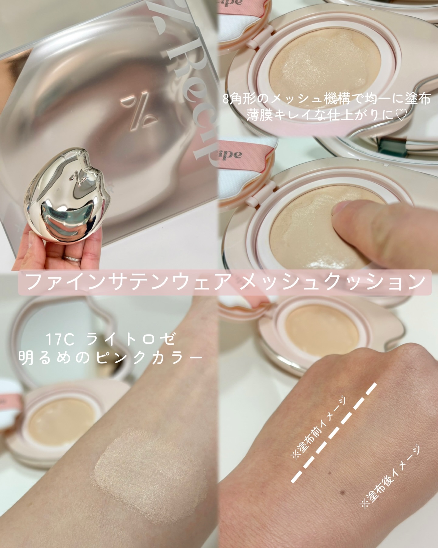 @recipe_.officialから提供いただきました。%RecipeXファインサテンウェアメッシュクッションバーミーパフポットリップ&チークXファインサテンウェアメッシュクッションは、微粒子化されたパウダーが肌の凹凸にぴたりと密着し、なめ...