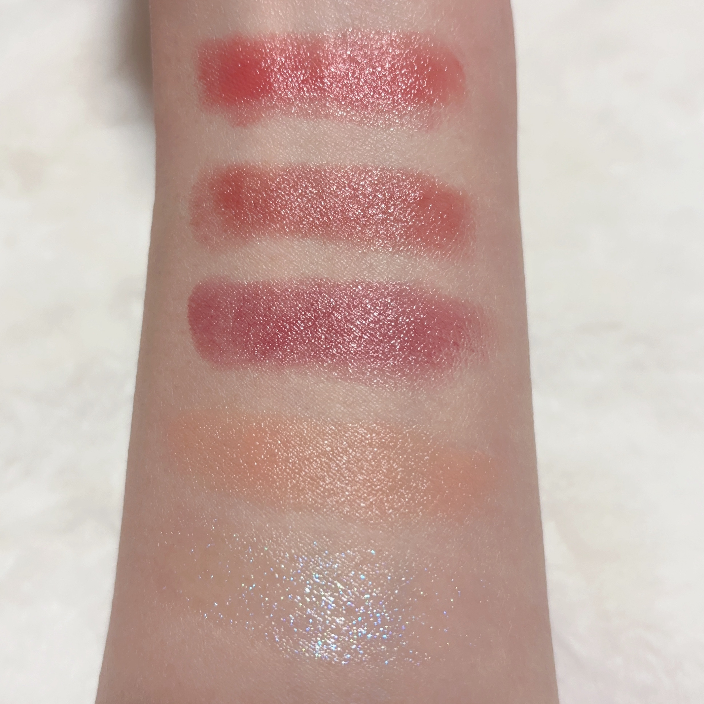 唇にのせるとキラキラはしますが、色味はないですが…個人的に単品でつけると 血色の悪い唇になってしまうので 手持ちのリップにプラスした方が、可愛いと思います💗 肌馴染みがよく、使いやすい色です☺️ ピンクがかった赤でゴールドラメがキラキラと美しいです💖 発色もよく使いやすい色だと思います☺️ ラメが光の角度できらめいて、また違う印象に見え美しいです❤️ テクスチャーは軽めで、アプリケーターも小ぶりで塗りやいです! 香りはレッドベリー・フローラル・バニラ・ムスクの甘い香りがしますが、甘い香りが苦手な私でも、キツくなく心地よく使用できました☺️