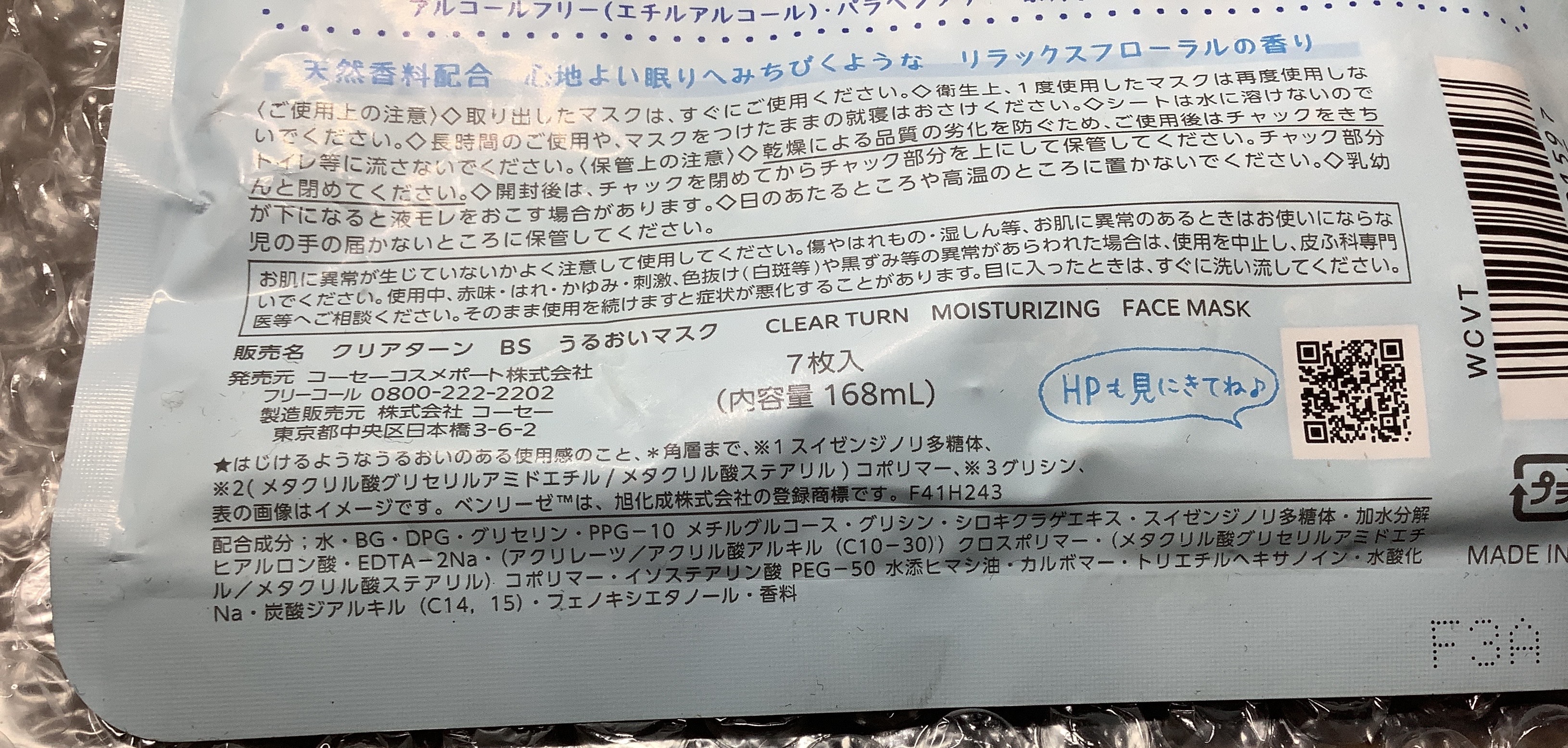 - <毛穴小町マスク> 水、BG、グリセリン、カルボマー、フェノキシエタノール、香料、トリエチルヘキサノイン、ドクダミエキス、DPG、コメヌカエキス、リンゴ酸、水酸化Na、イソノナン酸イソトリデシル、EDTA-2Na、(アクリレーツ/アクリル酸アルキル(C10-30))クロスポリマー、ツボクサ葉エキス、コメ発酵液、イソステアリン酸PEG-50水添ヒマシ油