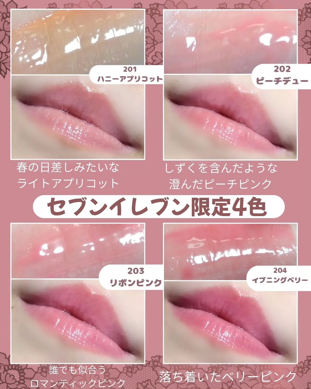 - <数量限定発売> ガラスのようなツヤとクリアな発色が特徴のミニティント。 通常版より小さいポケットサイズで、外出時の塗り直しにも便利です。 販売場所:全国のセブン-イレブン店舗※ 発売日:2025年12月10日(水)より順次 ※一部お取り扱いのない店舗がございます。なくなり次第終了となります。