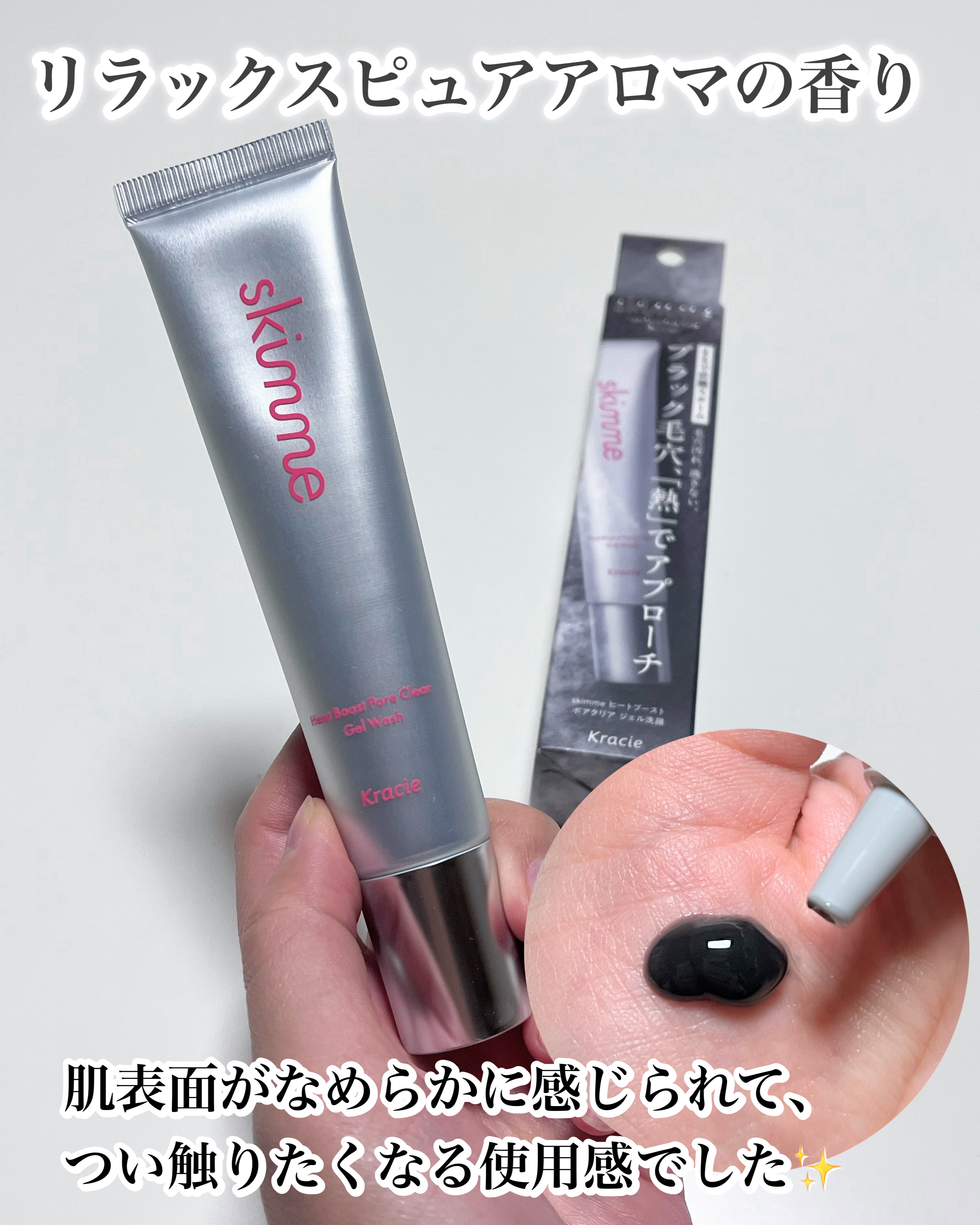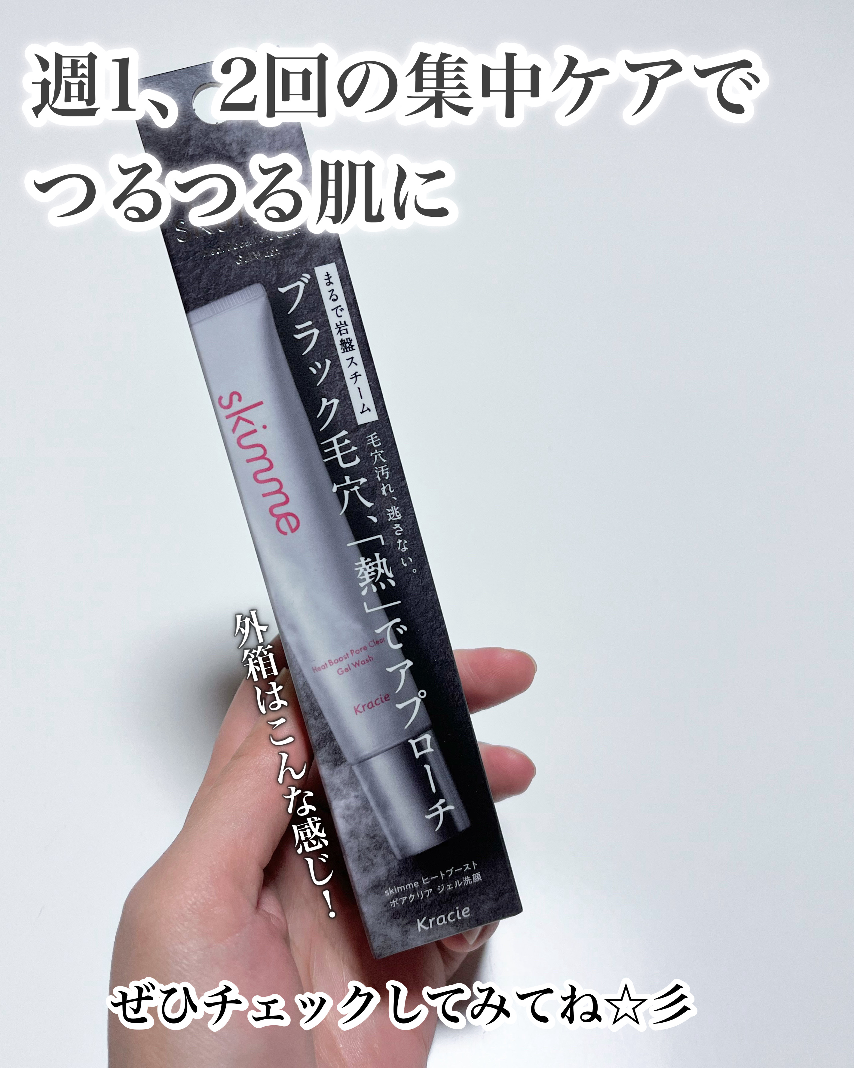 クラシエskimmeヒートブーストポアクリアジェル洗顔ブラック毛穴、熱でアプローチ!じんわり温感×炭×クレイのトリプルアプローチで頑固な角栓をじゅるりと除去する毛穴用ジェル洗顔洗顔後、顔の水を拭き取ってから使用。粘りのあるジェルで、気になる部...