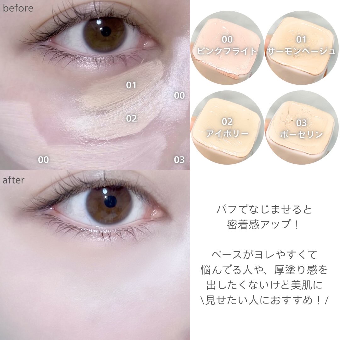 - <00 ピンクブライト> トリ(カプリル酸/カプリン酸)グリセリル、オクチルドデカノール、ヤシ油脂肪酸デシル、ダイマージリノール酸水添ヒマシ油、ポリブテン、合成ワックス、ヒマワリ種子ロウ、ラウリン酸ヘキシル、リンゴ種子油、イソステアリン酸ソルビタン、ポリヒドロキシステアリン酸、ツバキ種子油、シリカ、パルミチン酸エチルヘキシル、ミリスチン酸イソプロピル、イソステアリン酸、レシチン、ステアラルコニウムヘクトライト、ポリリシノレイン酸ポリグリセリル-3、香料、ジミリスチン酸Al、炭酸プロピレン、(ビニルジメチコン/メチコンシルセスキオキサン)クロスポリマー、カプリリルグリコール、カプリル酸グリセリル、加水分解ヒアルロン酸、マデカッソシド、ナイアシンアミド、PCA亜鉛、水、グリセリン、1,2-ヘキサンジオール、水溶性コラーゲン、酸化チタン、マイカ、酸化鉄 <01 サーモンベージュ> トリ(カプリル酸/カプリン酸)グリセリル、オクチルドデカノール、ヤシ油脂肪酸デシル、ダイマージリノール酸水添ヒマシ油、ポリブテン、合成ワックス、ヒマワリ種子ロウ、ラウリン酸ヘキシル、リンゴ種子油、イソステアリン酸ソルビタン、ポリヒドロキシステアリン酸、ツバキ種子油、シリカ、レシチン、パルミチン酸エチルヘキシル、ミリスチン酸イソプロピル、イソステアリン酸、ステアラルコニウムヘクトライト、ポリリシノレイン酸ポリグリセリル-3、香料、炭酸プロピレン、(ビニルジメチコン/メチコンシルセスキオキサン)クロスポリマー、ジミリスチン酸Al、カプリリルグリコール、カプリル酸グリセリル、加水分解ヒアルロン酸、マデカッソシド、ナイアシンアミド、PCA亜鉛、水、グリセリン、1,2-ヘキサンジオール、水溶性コラーゲン、酸化チタン、マイカ、酸化鉄 <02 アイボリー> トリ(カプリル酸/カプリン酸)グリセリル、オクチルドデカノール、ヤシ油脂肪酸デシル、ダイマージリノール酸水添ヒマシ油、ポリブテン、合成ワックス、ヒマワリ種子ロウ、ラウリン酸ヘキシル、リンゴ種子油、イソステアリン酸ソルビタン、ポリヒドロキシステアリン酸、ツバキ種子油、シリカ、レシチン、パルミチン酸エチルヘキシル、ミリスチン酸イソプロピル、イソステアリン酸、ステアラルコニウムヘクトライト、ポリリシノレイン酸ポリグリセリル-3、香料、ジミリスチン酸Al、炭酸プロピレン、(ビニルジメチコン/メチコンシルセスキオキサン)クロスポリマー、カプリリルグリコール、カプリル酸グリセリル、加水分解ヒアルロン酸、マデカッソシド、ナイアシンアミド、PCA亜鉛、水、グリセリン、1,2-ヘキサンジオール、水溶性コラーゲン、酸化チタン、マイカ、酸化鉄 <03 ポーセリン> トリ(カプリル酸/カプリン酸)グリセリル、オクチルドデカノール、ヤシ油脂肪酸デシル、ダイマージリノール酸水添ヒマシ油、ポリブテン、合成ワックス、ヒマワリ種子ロウ、ラウリン酸ヘキシル、リンゴ種子油、イソステアリン酸ソルビタン、ポリヒドロキシステアリン酸、ツバキ種子油、シリカ、レシチン、パルミチン酸エチルヘキシル、ミリスチン酸イソプロピル、イソステアリン酸、ステアラルコニウムヘクトライト、ポリリシノレイン酸ポリグリセリル-3、香料、ジミリスチン酸Al、炭酸プロピレン、(ビニルジメチコン/メチコンシルセスキオキサン)クロスポリマー、カプリリルグリコール、カプリル酸グリセリル、加水分解ヒアルロン酸、マデカッソシド、ナイアシンアミド、PCA亜鉛、水、グリセリン、1,2-ヘキサンジオール、水溶性コラーゲン、酸化チタン、マイカ、酸化鉄