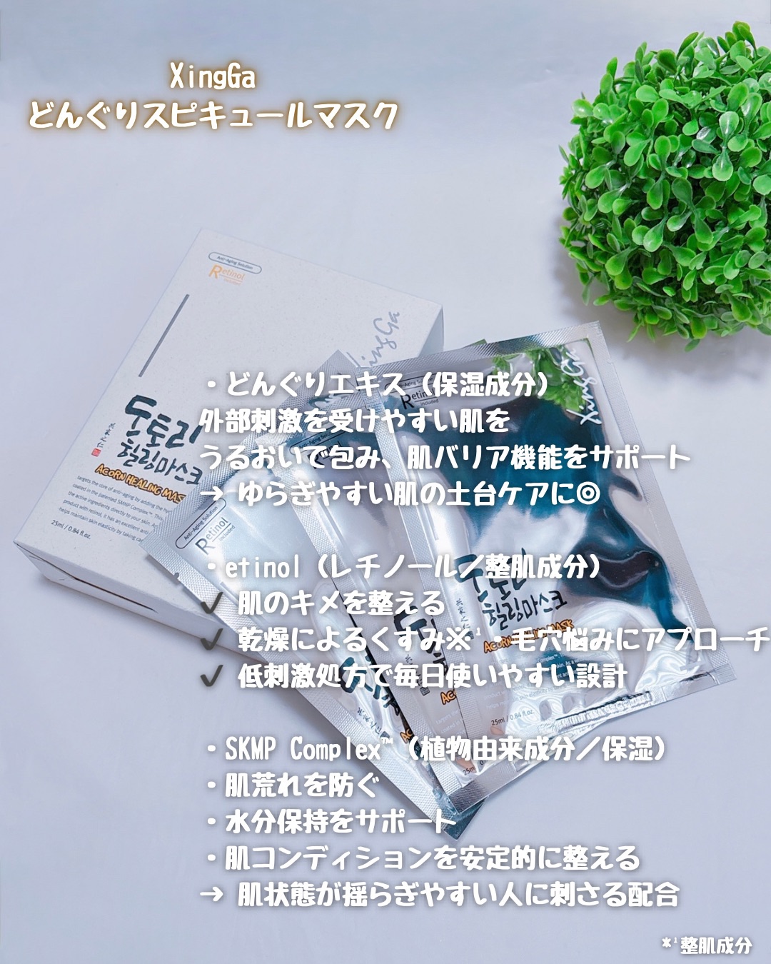 肌がゆらぎやすい時期のデイリーケアに🌿XingGaどんぐりスピキュールマスク✨低刺激設計のレチノール配合で、敏感肌・トラブル肌でも使いやすいシートマスク🌿🌰どんぐり由来成分が外部刺激を受けやすい肌をすこやかに保ち、肌バリアをやさしくサポート。...