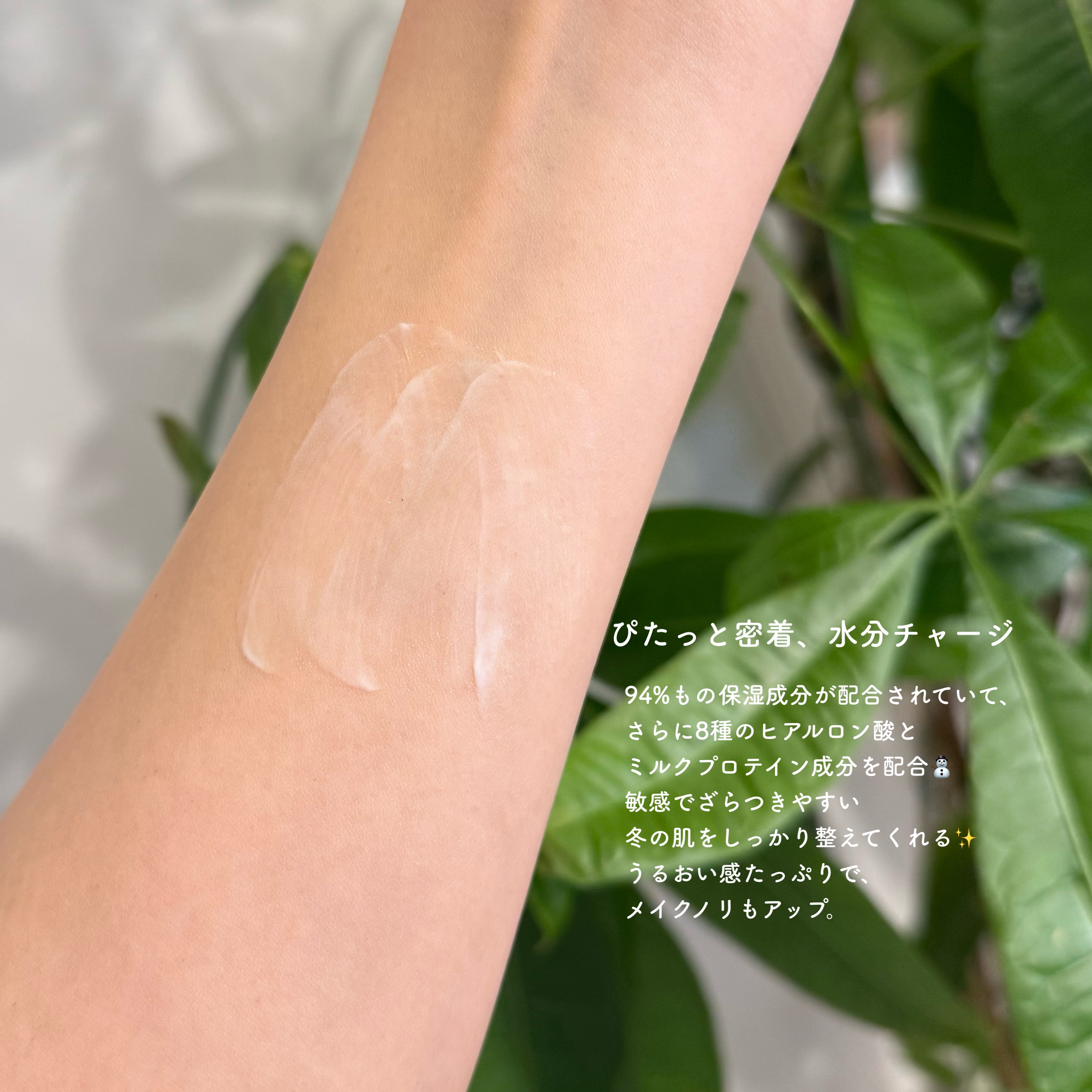 - ◇スキンケア成分94%配合 8種類のヒアルロン酸*1 お肌の保湿と水分保持 乳タンパク お肌にハリを与える アンチセバムP*2 毛穴を引き締め、水分と油分のバランスを整える ◇スキンケアクリームとしても使えるマルチクリーム 化粧下地だけでなく、スキンケアの最後のクリームとしても使用できます。 メイク前にスキンケアと化粧下地の相性を気にすることなく、これ1本で仕上げることができます。 ◇3つのフリー ミネラルオイルフリー、アルコールフリー、パラベンフリー *1 ヒアルロン酸Na、ヒアルロン酸ヒドロキシプロピルトリモニウム、アセチルヒアルロン酸Na、加水分解ヒアルロン酸、ヒアルロン酸クロスポリマーNa、加水分解ヒアルロン酸Na、ヒアルロン酸、ヒアルロン酸K *2 メマツヨイグサ花エキス、ウルムスダビディアナ根エキス、ダイオウショウ葉エキス、クズ根エキス