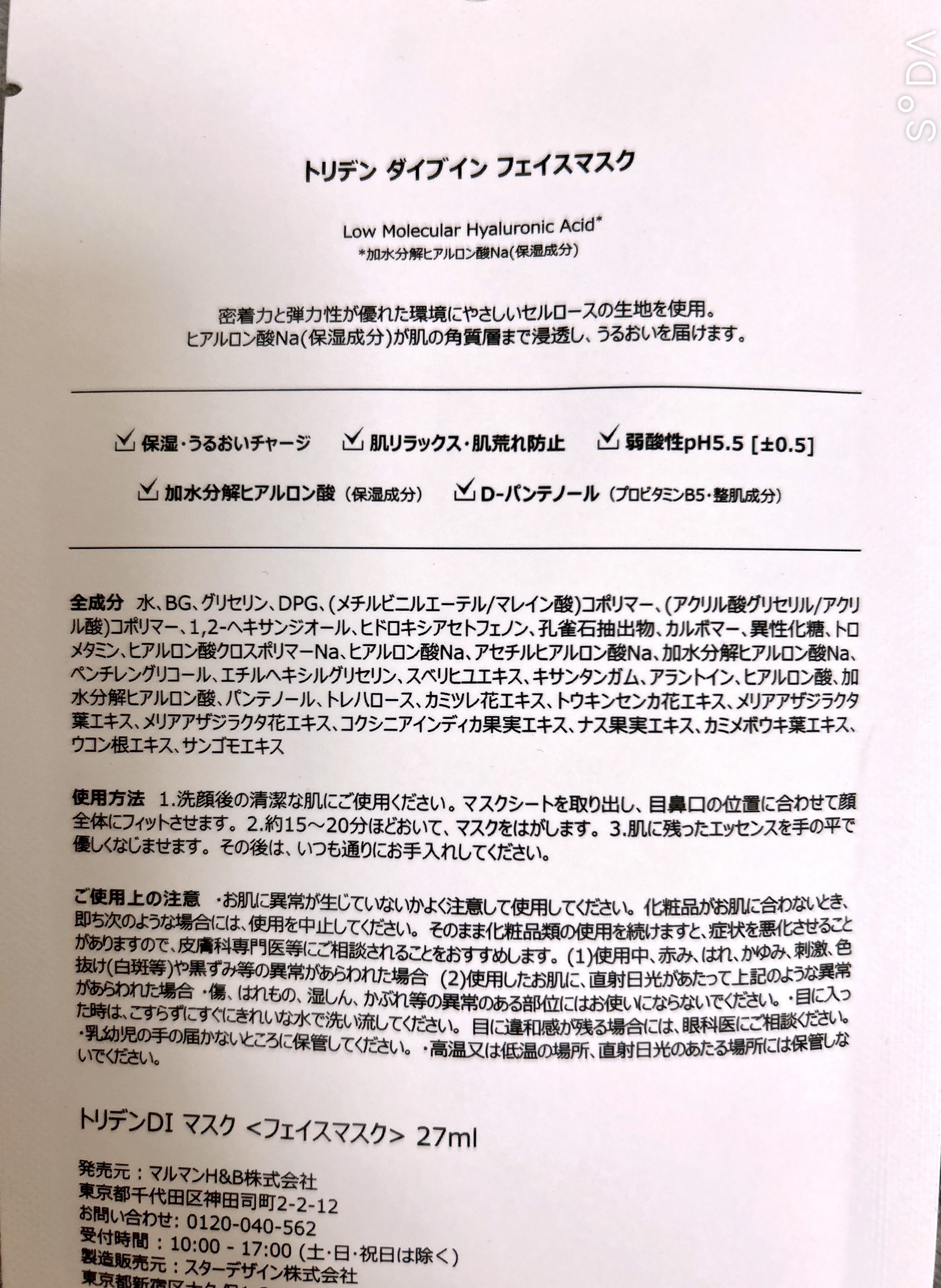 - <1枚> 水、BG、グリセリン、DPG、(メチルビニルエーテル/マレイン酸)コポリマー、(アクリル酸グリセリル/アクリル酸)コポリマー、1,2-ヘキサンジオール、ヒドロキシアセトフェノン、孔雀石抽出物、カルボマー、異性化糖、トロメタミン、ヒアルロン酸クロスポリマーNa、ヒアルロン酸Na、アセチルヒアルロン酸Na、加水分解ヒアルロン酸Na、ペンチレングリコール、エチルヘキシルグリセリン、スベリヒユエキス、キサンタンガム、アラントイン、ヒアルロン酸、加水分解ヒアルロン酸、パンテノール、トレハロース、カミツレ花エキス、トウキンセンカ花エキス、メリアアザジラクタ葉エキス、メリアアザジラクタ花エキス、コクシニアインディカ果実エキス、ナス果実エキス、カミメボウキ葉エキス、ウコン根エキス、サンゴモエキス <3枚> 水、BG、グリセリン、DPG、(メチルビニルエーテル/マレイン酸)コポリマー、(アクリル酸グリセリル/アクリル酸)コポリマー、1,2-ヘキサンジオール、ヒドロキシアセトフェノン、乳雀石抽出物、カルボマー、異性化糖、トロメタミン、ヒアルロン酸クロスポリマーNa、ヒアルロン酸Na、アセチルヒアルロン酸Na、加水分解ヒアルロン酸Na、ペンチレングリコール、エチルヘキシルグリセリン、スベリヒユエキス、キサンタンガム、アラントイン、ヒアルロン酸、加水分解ヒアルロン酸、パンテノール、トレハロース、カミツレ花エキス、トウキンセンカ花エキス、メリアアザジラクタ葉エキス、メリアアザジラクタ花エキス、コクシニアインディカ果実エキス、ナス果実エキス、カミメボウキ葉エキス、ウコン根エキス、サンゴモエキス <10枚> 水、BG、グリセリン、DPG、(メチルビニルエーテル/マレイン酸)コポリマー、(アクリル酸グリセリル/アクリル酸)コポリマー、1,2-ヘキサンジオール、ヒドロキシアセトフェノン、孔雀石抽出物、カルボマー、異性化糖、トロメタミン、ヒアルロン酸クロスポリマーNa、ヒアルロン酸Na、アセチルヒアルロン酸Na、加水分解ヒアルロン酸Na、ペンチレングリコール、エチルヘキシルグリセリン、スベリヒユエキス、キサンタンガム、アラントイン、ヒアルロン酸、加水分解ヒアルロン酸、パンテノール、トレハロース、カミツレ花エキス、トウキンセンカ花エキス、メリアアザジラクタ葉エキス、メリアアザジラクタ花エキス、コクシニアインディカ果実エキス、ナス果実エキス、カミメボウキ葉エキス、ウコン根エキス、サンゴモエキス