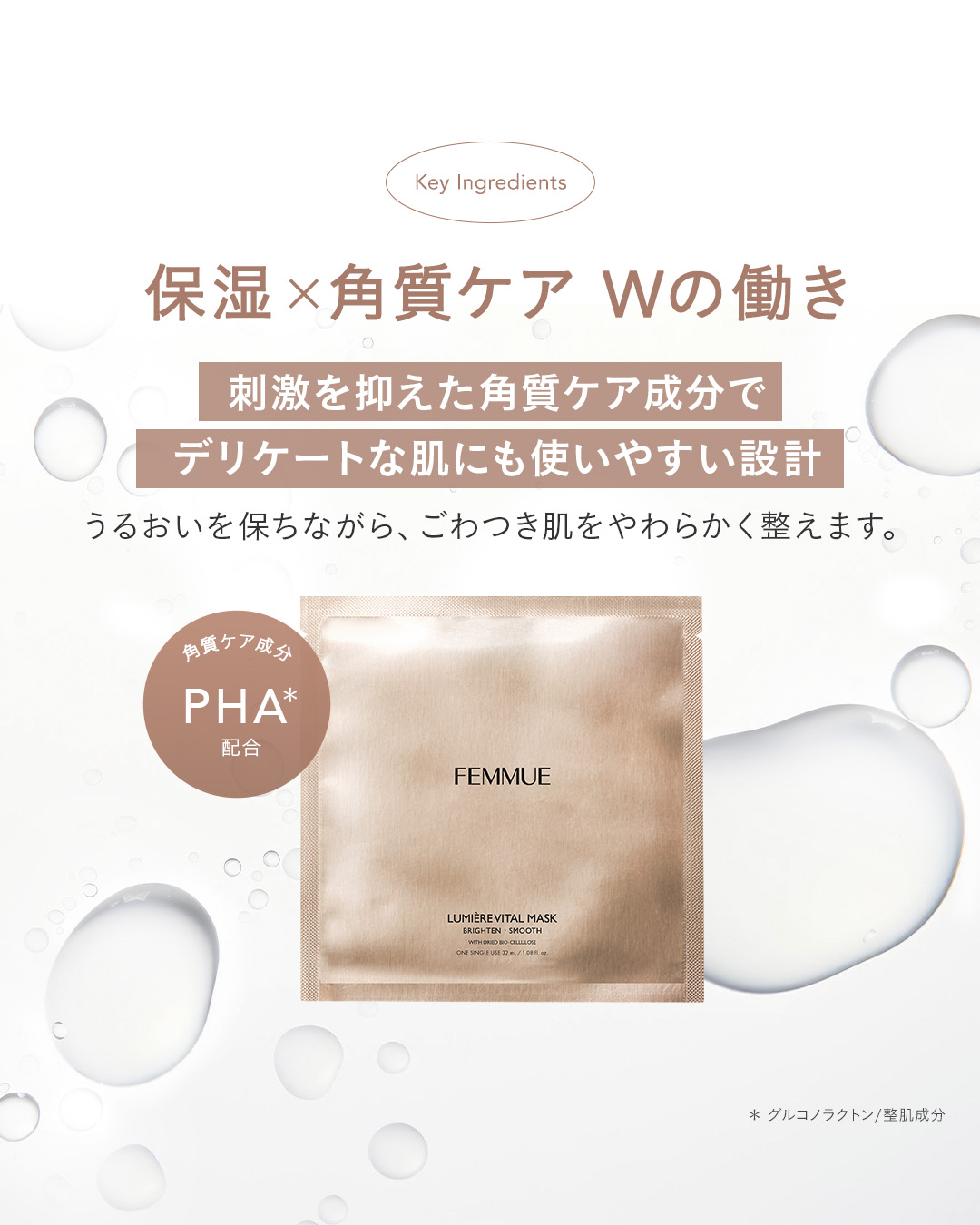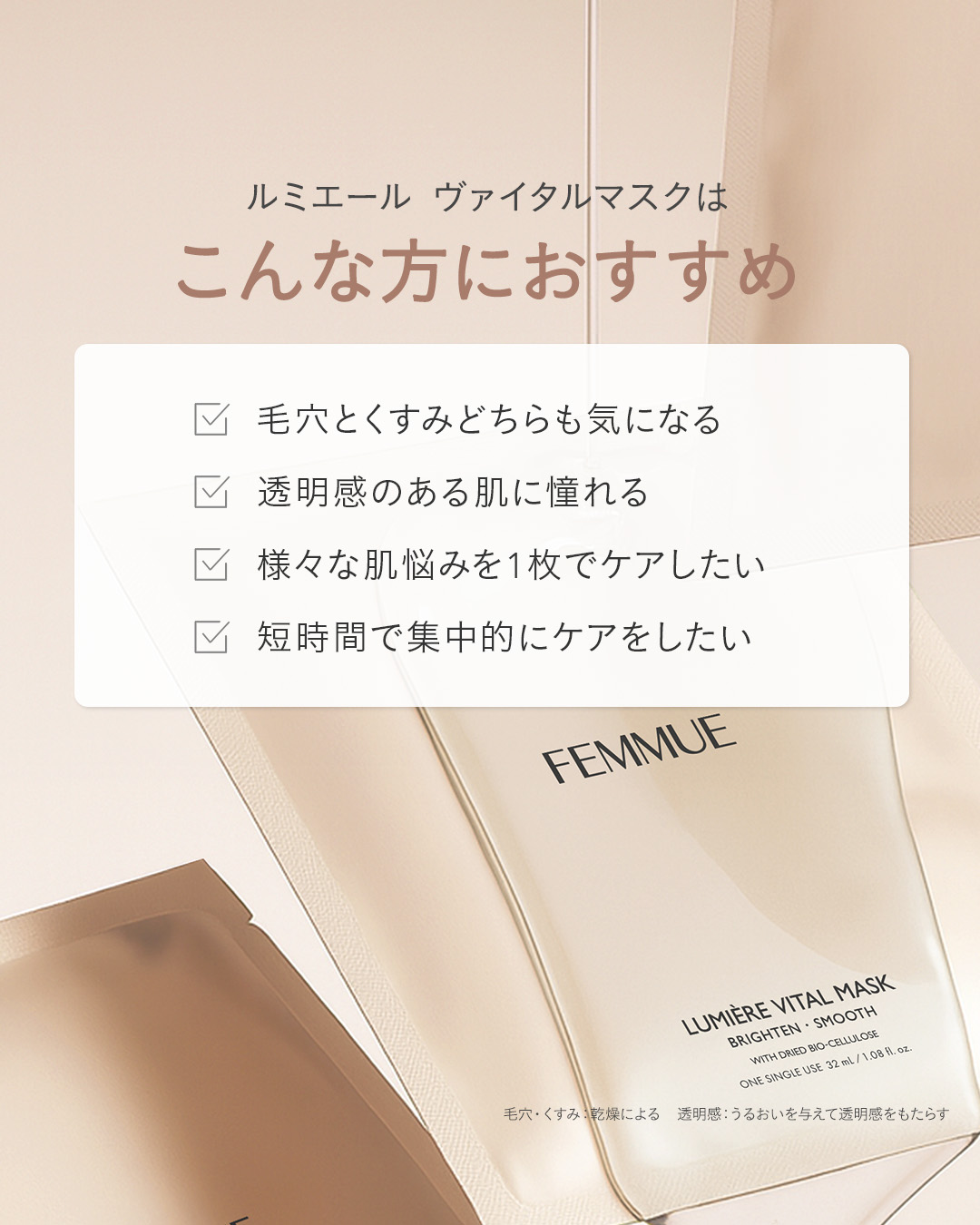 - FEMMUEを代表するスキンケア「ルミエールライン」のシートマスク<ルミエールヴァイタルマスク>が、リニューアル。 「ルミエールライン」のソリューションを多くの方に体験していただきたいという思いを込めて、内側から輝くような透明感*1のある肌へ導く美容成分を、気軽に試せるシートマスクに詰め込みました。特許技術によるシート素材「ハイドラ ドライバイオセルロースシート」を採用し、ビタミンCを安定して肌に届けるビタミンC誘導体*2をはじめ、ビタミンB3として知られるナイアシンアミド、ツボクサ由来のMade Snow(マデカッソシド)によって内側から輝く肌へ。 さらに角質をケアするPHA*3やすこやかな肌をサポートするCS HERB COMPLEX*4を配合し、透明感*1、キメ、肌荒れのケアまで、マルチに働きかけます。 清々しくもやさしい、ハーバルフローラルの香り。 *1 うるおいを与えて透明感をもたらす *2 アスコルビルグルコシド *3 グルコノラクトン *4 ツボクサエキス、イタドリ根エキス、オウゴン根エキス、チャ葉エキス、カンゾウ根エキス、ローズマリー葉エキス、カミツレ花エキス