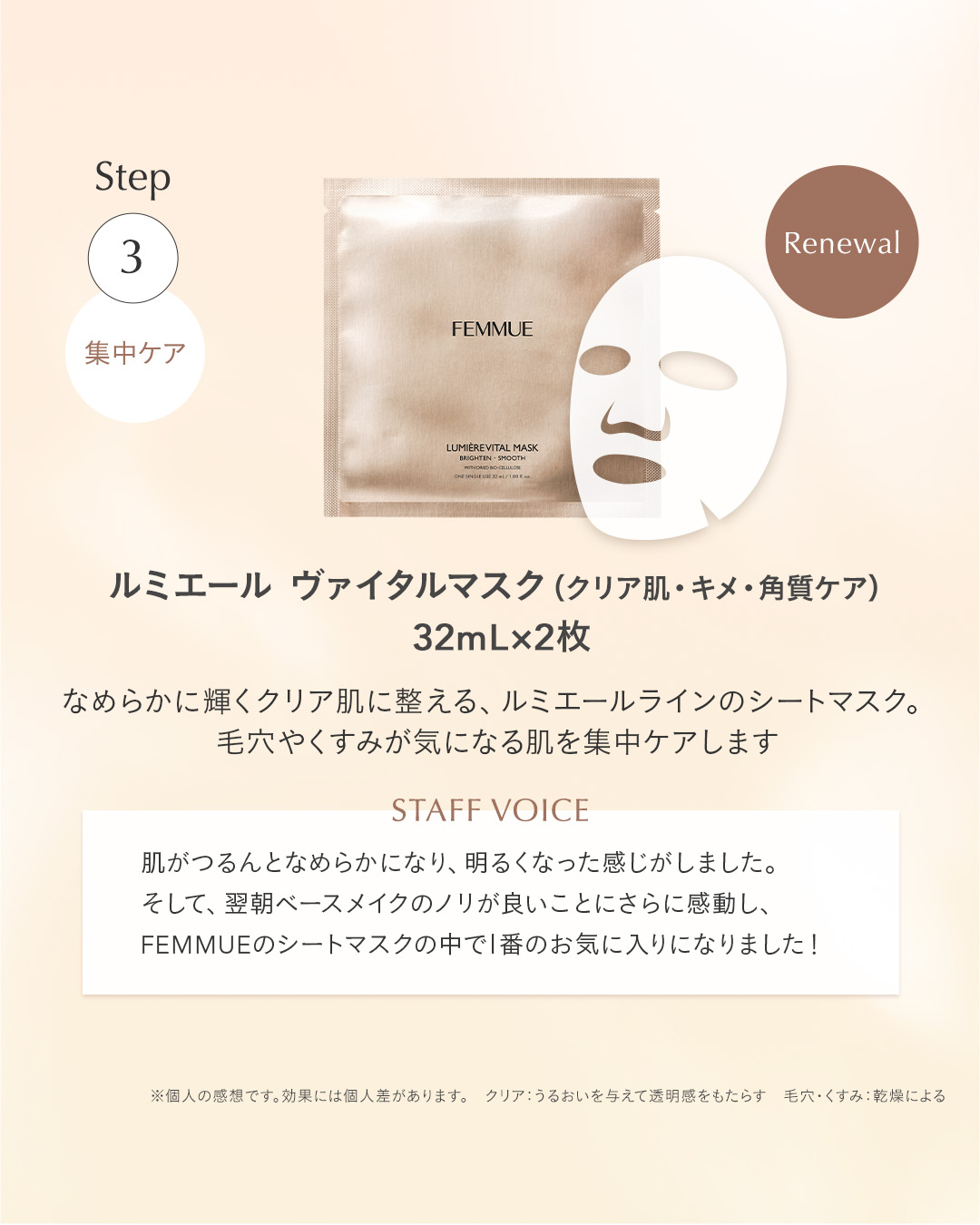 - 肌の内側から輝くような透明感*1。 FEMMUE人気No.1*2スキンケアラインとリニューアルしたシートマスクが試せる限定キット。 *1うるおいを与えて透明感をもたらす *2自社調べ <セット内容> 【ルミエール ヴァイタルC】10mL 【ルミエール ヴァイタルマスク】32mL×2枚 【ルミエール リファイナー】1mL×5枚 【ルミエール コンセントレートクリーム】1g×5枚