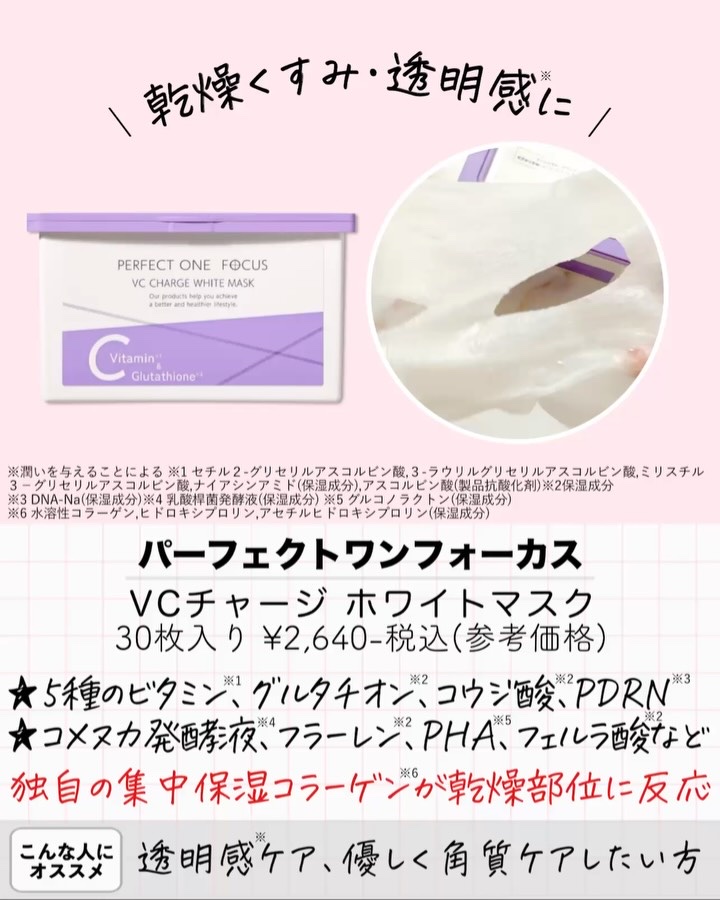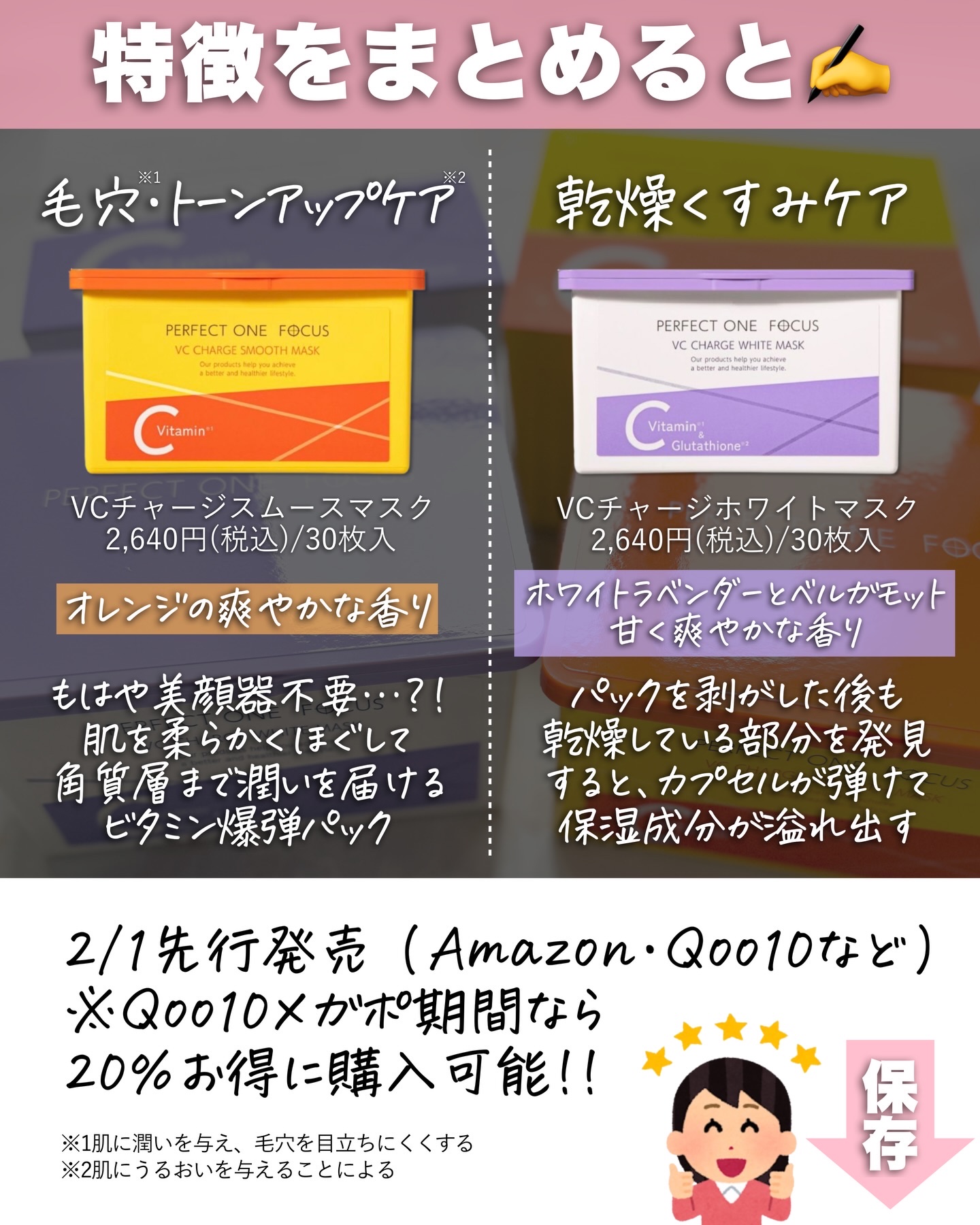 @perfectone_focusパーフェクトワンフォーカス「VCチャージスムースマスク」¥880クレンジングバームが有名なパーフェクトワンフォーカスから新発売となったこちらのシートマスク✨️「パーフェクトワンフォーカス」史上最多の10種類の...