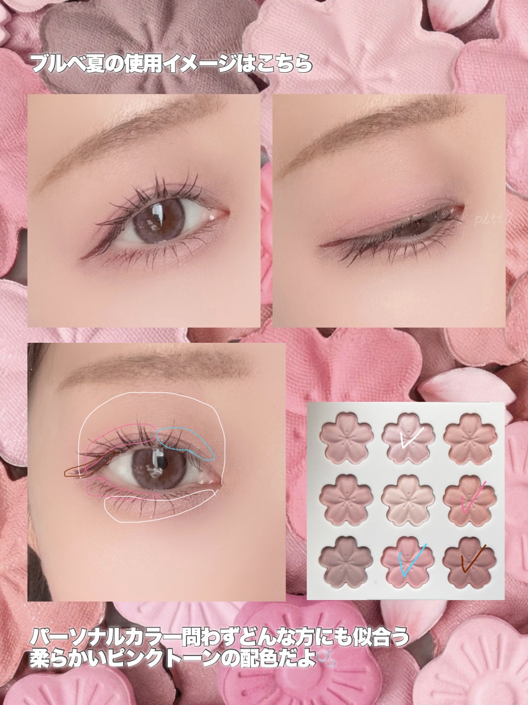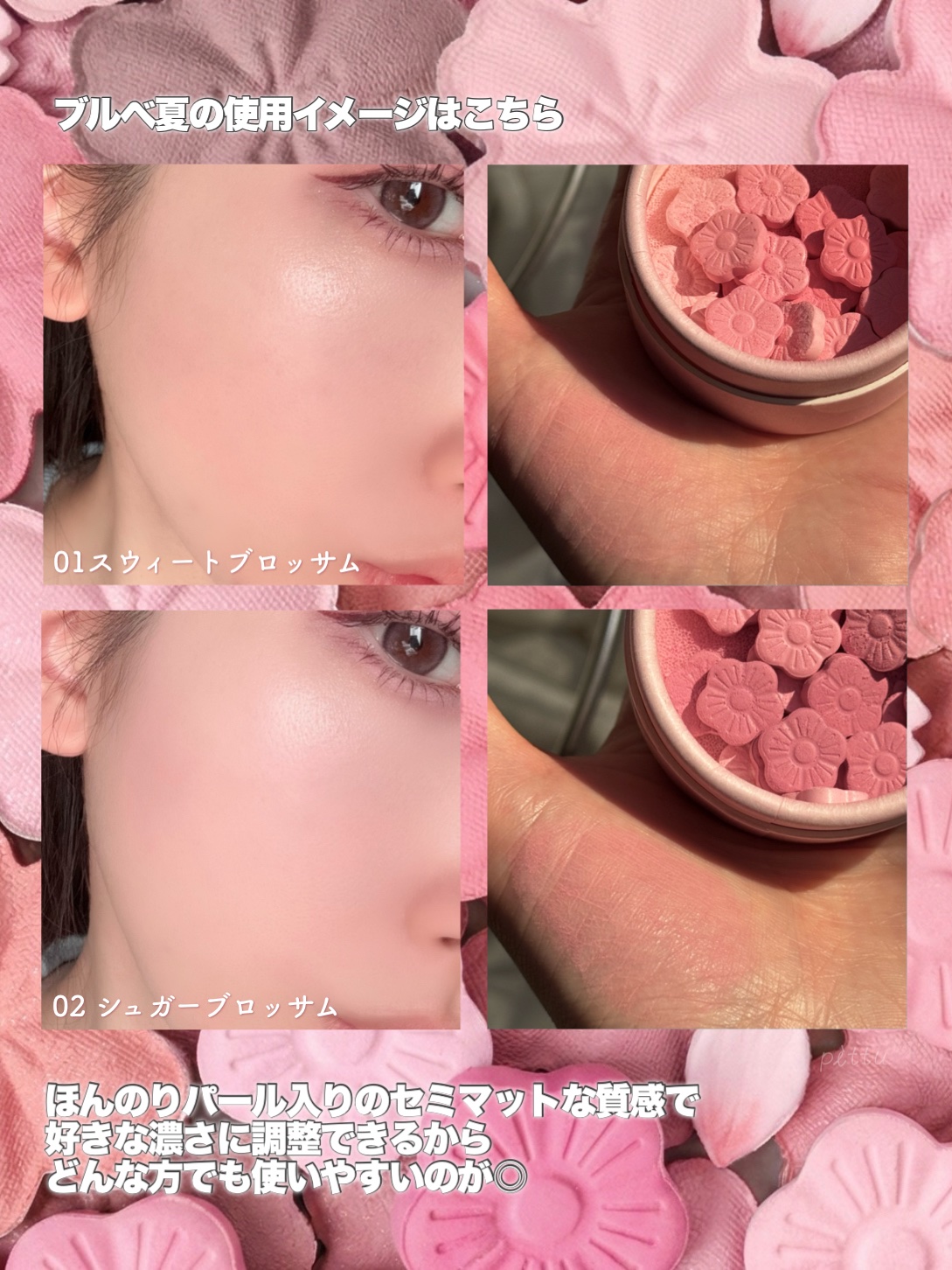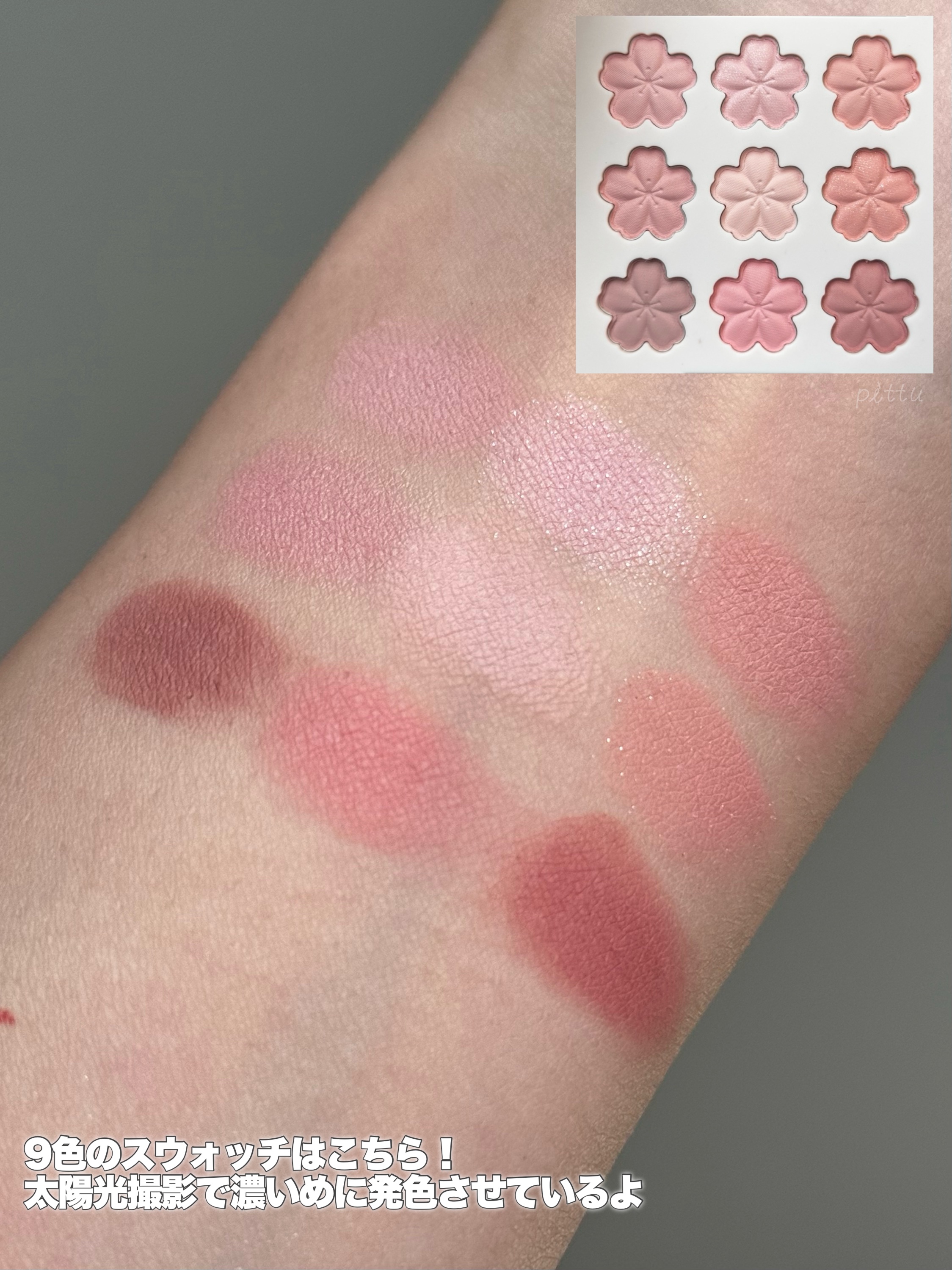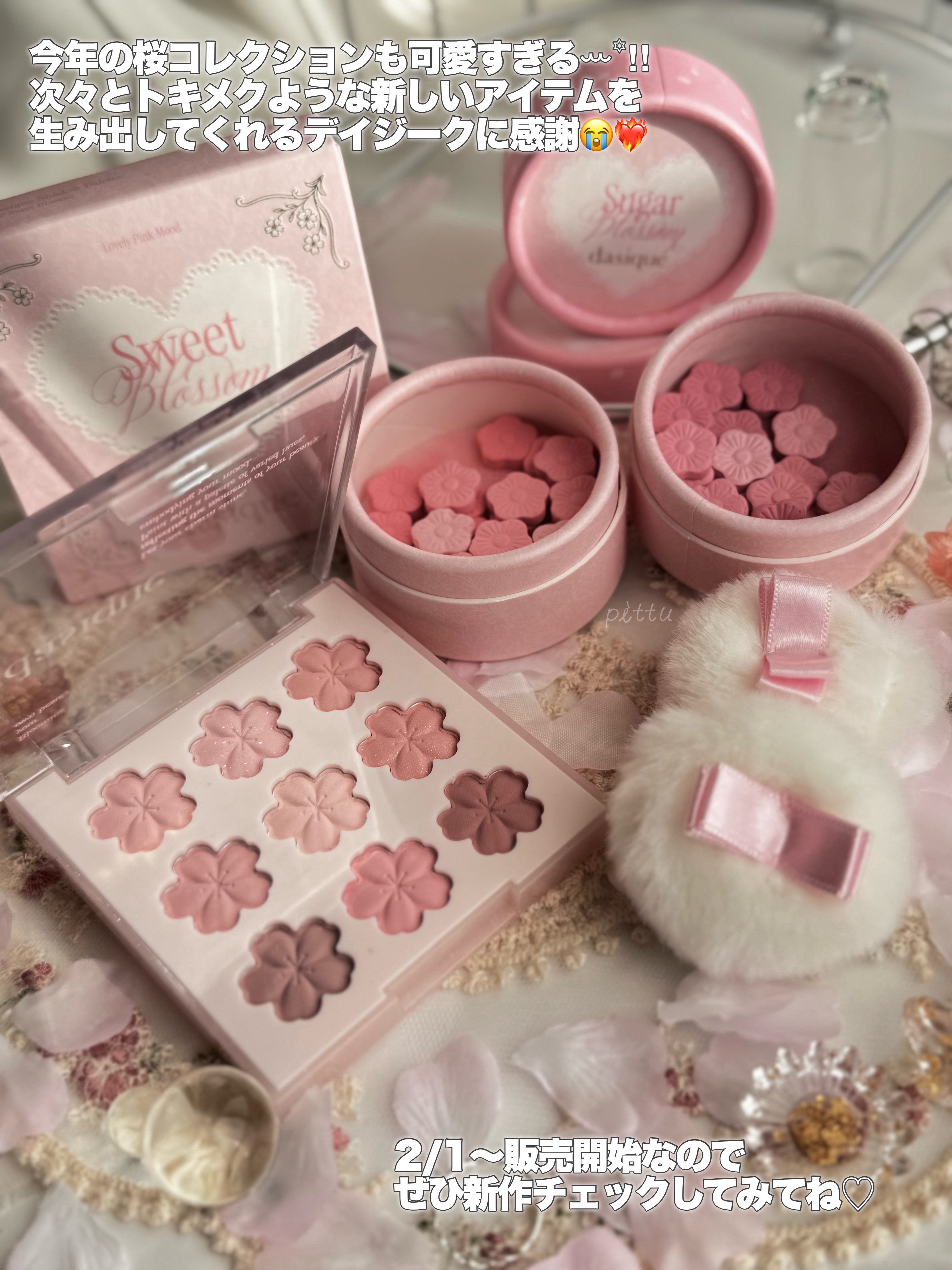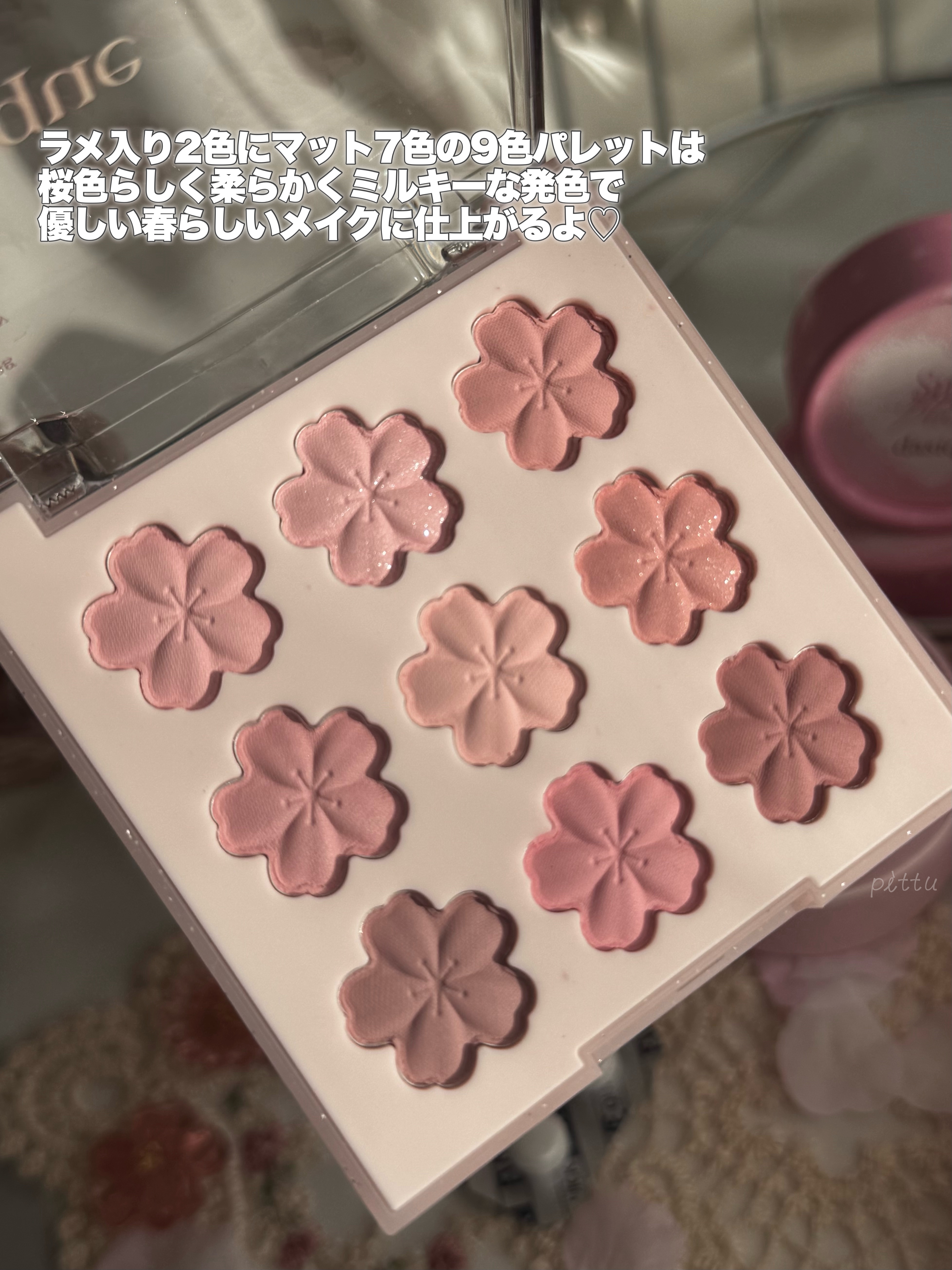 - 訪れる春のときめきを、桜の花びらに閉じ込めたスウィートブロッサム アイシャドウパレット。 #01 訪れる春のときめきを、舞い散る桜の花びらにインスピレーションを得て表現したアイシャドウパレット。 #02 やわらかく可憐なピンクトーンを基調とした9色構成で、ナチュラルな血色感メイクから、深みのある上品なアイメイクまで幅広く演出します。 #03 カシミヤのようにしっとりなめらかなマットテクスチャが、まぶたに密着し、クリアで美しい発色を実現。 #04 ムラになりにくく、誰でも簡単に自然で美しいブレンディングが可能です。 春の始まりを告げる、桜のように甘く愛らしいピンクピーチの香りを閉じ込めた『スウィートブロッサム コレクション』 咲き誇る花々の香りの中で、最も甘くやさしく広がる Sweet Blossom. ほんのりと広がっていくピンクピーチと春の旅路を、ぜひご一緒にお楽しみください。
