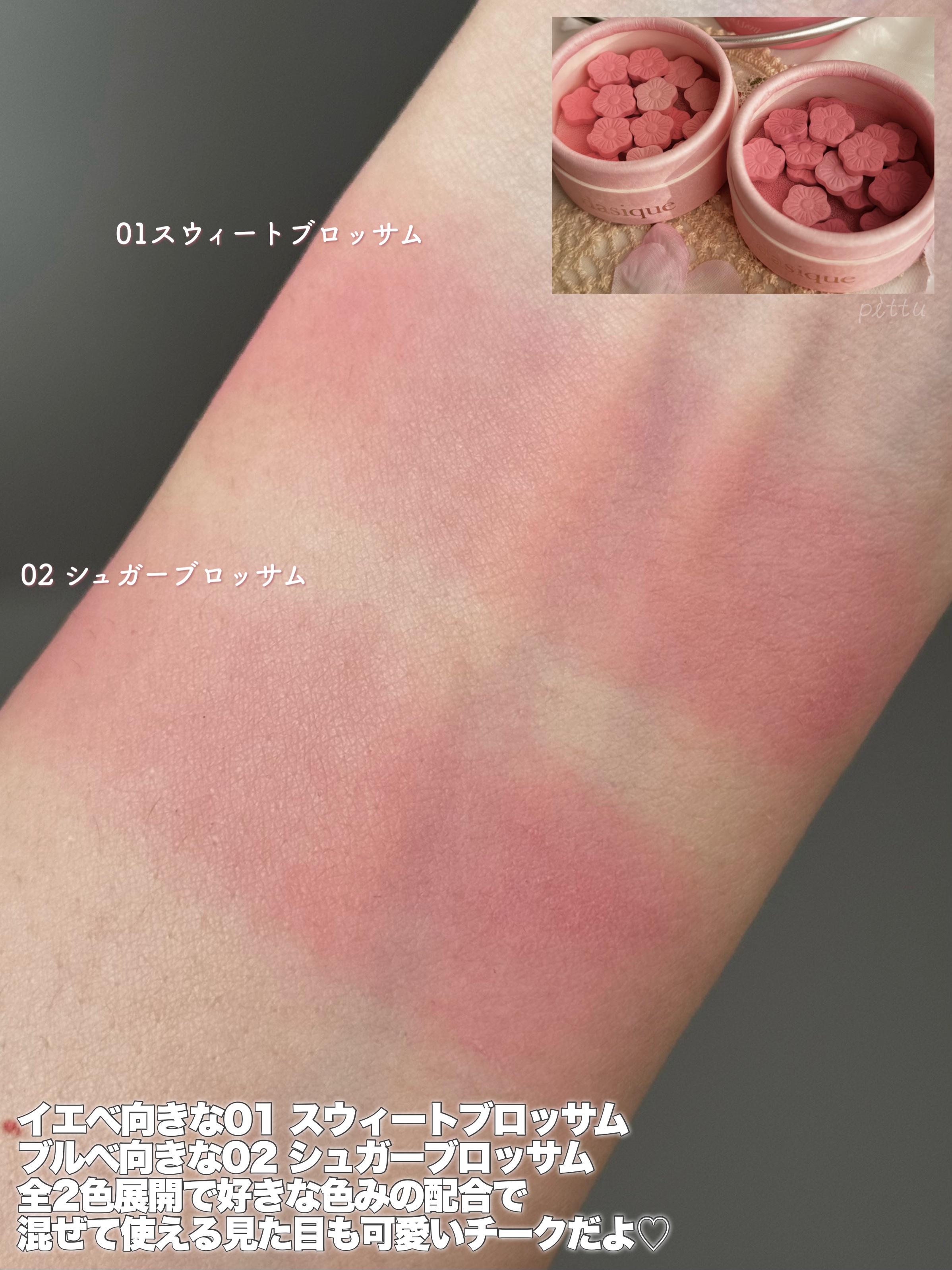 カラバリは2色展開、公式情報がないので不安ですがどうやら限定販売のようです! 01 プリュムフラワー ピンクベージュ系でまとめられたパレット 全体的にライトなピンクが多く、イエベ春の方向きに感じます 02 ボヌールマロン 赤みのあるカラーでまとめられたパレット 明るいカラーもありますがベージュや赤みブラウン等イエベ秋の方向きに感じます 表面のエンボス加工もかわいいのばっかりですね! ラメ強めが格子柄だからわかりやすいし、まとまりが良い⸜(๑⃙⃘'ᵕ'๑⃙⃘)⸝⋆* ちなみにこちらのパレットは8色も入っているのにかなりコンパクトで、1色の大きさが私の親指の爪よりちょい大きめという嬉しさ…! フタの水面のデザインは内側だけに施されているので、表面はツルッとしていますよ🌊 チップもふわふわで、多色パレット専用のサイズ感で長めなのが嬉しい♪ とにかく話題になっているこちら、可愛すぎるから在庫無くなるのお願い待って…🙏🏻💦