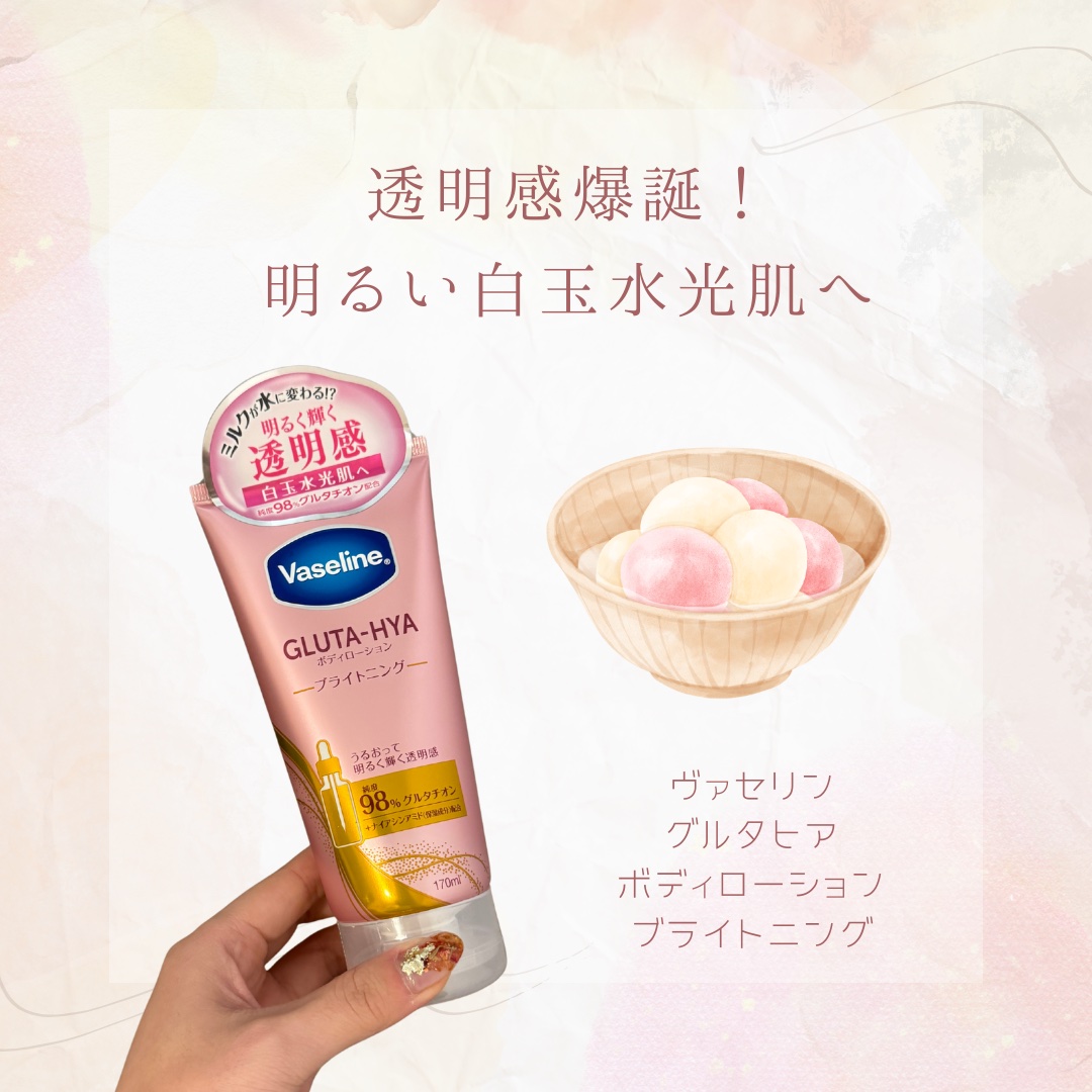 👉🏻Vaseline様より提供頂きました🙇♂️✨【Vaselineグルタヒアボディローションブライトニング🩷】\明るく輝く透明感❗️白玉水光肌へ‼️/✔︎︎︎︎純度98%グルタチオン配合肌のキメを整えくすみ(*1)をケア🎵✔︎︎︎︎4種のヒ...