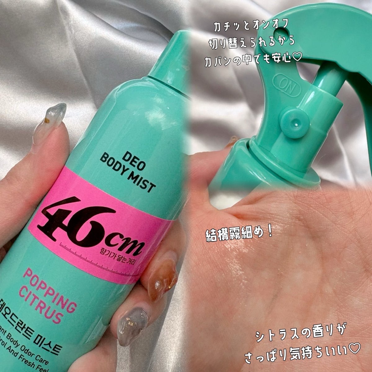 パーソナルスペース(密接距離)だけほんのり香る香りがふわっと届く距離、46cm。46cmデオドラントボディミスト私が使ったのはポッピングシトラス レモンとグレープフルーツが軽やかに弾ける爽やかな香りひと吹きで気になるニオイやベタつきをすばやく...
