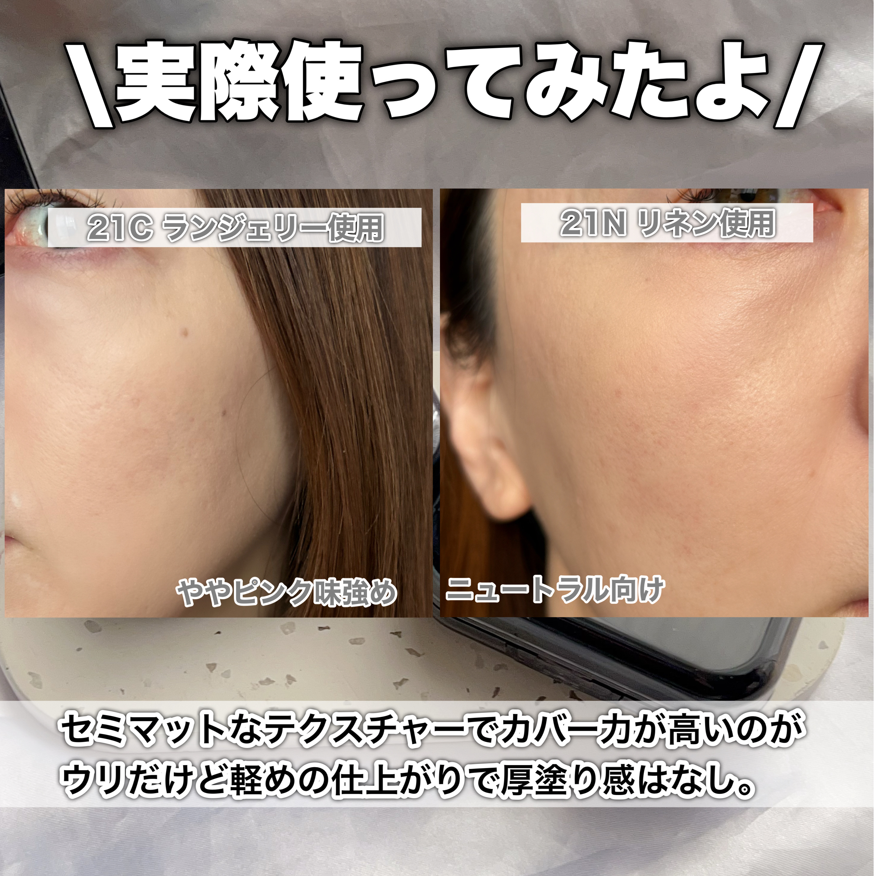 - <19Cライト> 水、ジメチコン、トリメチルシロキシケイ酸、イソドデカン、BG、エチルヘキサン酸セチル、ラウリルPEG-10トリス(トリメチルシロキシ)シリルエチルジメチコン、合成フルオロフロゴパイト、炭酸ジカプリリル、ナイアシンアミド、1,2-ヘキサンジオール、PEG-10ジメチコン、(ビスヒドロキシプロピルジメチコン/SMDI)コポリマー、硫酸Mg、ペンタイソステアリン酸ジペンタエリスリチル、ステアリン酸、トリエトキシカプリリルシラン、アルミナ、水酸化Al、(ジメチコン/ビニルジメチコン)クロスポリマー、オクチルドデカノール、香料、ジステアルジモニウムヘクトライト、アデノシン、エチレンジアミンジコハク酸3Na、イソステアリン酸ポリグリセリル-4、ジミリスチン酸Al、トリイソステアリン酸イソプロピルチタン、トコフェロール、ツボクサ葉エキス、酸化チタン、酸化鉄、マイカ <21C ランジェリー> 水、ジメチコン、トリメチルシロキシケイ酸、イソドデカン、BG、エチルヘキサン酸セチル、ラウリルPEG-10トリス(トリメチルシロキシ)シリルエチルジメチコン、合成フルオロフロゴパイト、炭酸ジカプリリル、ナイアシンアミド、1,2-ヘキサンジオール、PEG-10ジメチコン、(ビスヒドロキシプロピルジメチコン/SMDI)コポリマー、硫酸Mg、ペンタイソステアリン酸ジペンタエリスリチル、オクチルドデカノール、ステアリン酸、トリエトキシカプリリルシラン、アルミナ、水酸化Al、(ジメチコン/ビニルジメチコン)クロスポリマー、香料、ジステアルジモニウムヘクトライト、イソステアリン酸ポリグリセリル-4、アデノシン、エチレンジアミンジコハク酸3Na、ジミリスチン酸Al、トリイソステアリン酸イソプロピルチタン、トコフェロール、ツボクサ葉エキス、酸化チタン、酸化鉄、マイカ <21N リネン> 水、ジメチコン、トリメチルシロキシケイ酸、イソドデカン、BG、エチルヘキサン酸セチル、ラウリルPEG-10トリス(トリメチルシロキシ)シリルエチルジメチコン、合成フルオロフロゴパイト、炭酸ジカプリリル、ナイアシンアミド、1,2-ヘキサンジオール、PEG-10ジメチコン、(ビスヒドロキシプロピルジメチコン/SMDI)コポリマー、硫酸Mg、ペンタイソステアリン酸ジペンタエリスリチル、オクチルドデカノール、ステアリン酸、トリエトキシカプリリルシラン、アルミナ、水酸化Al、(ジメチコン/ビニルジメチコン)クロスポリマー、香料、ジステアルジモニウムヘクトライト、イソステアリン酸ポリグリセリル-4、アデノシン、エチレンジアミンジコハク酸3Na、ジミリスチン酸Al、トリイソステアリン酸イソプロピルチタン、トコフェロール、ツボクサ葉エキス、酸化チタン、酸化鉄、マイカ <23N ジンジャー> 水、ジメチコン、トリメチルシロキシケイ酸、イソドデカン、BG、エチルヘキサン酸セチル、ラウリルPEG-10トリス(トリメチルシロキシ)シリルエチルジメチコン、合成フルオロフロゴパイト、炭酸ジカプリリル、ナイアシンアミド、1,2-ヘキサンジオール、PEG-10ジメチコン、(ビスヒドロキシプロピルジメチコン/SMDI)コポリマー、オクチルドデカノール、硫酸Mg、ペンタイソステアリン酸ジペンタエリスリチル、ステアリン酸、トリエトキシカプリリルシラン、アルミナ、水酸化Al、(ジメチコン/ビニルジメチコン)クロスポリマー、香料、イソステアリン酸ポリグリセリル-4、ジステアルジモニウムヘクトライト、トリイソステアリン酸イソプロピルチタン、アデノシン、エチレンジアミンジコハク酸3Na、ジミリスチン酸Al、トコフェロール、ツボクサ葉エキス、酸化チタン、酸化鉄、マイカ
