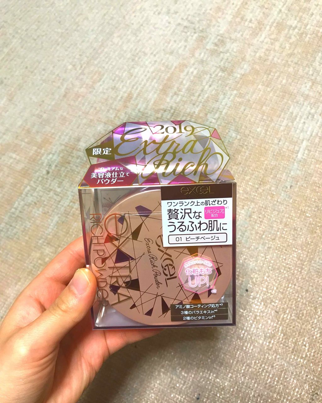 2015年から大人気のexcel冬季限定パウダー エクストラリッチパウダーが10周年記念パッケージで今年も発売されました! アミノ酸コーティング処方 お肌にしっとりと密着し、極上のうるふわ肌に。 乾燥しがちな私の肌もしっとりふんわり仕上がりました✨ パフのフカフカが気持ちよくてとっても使いやすかったですෆ