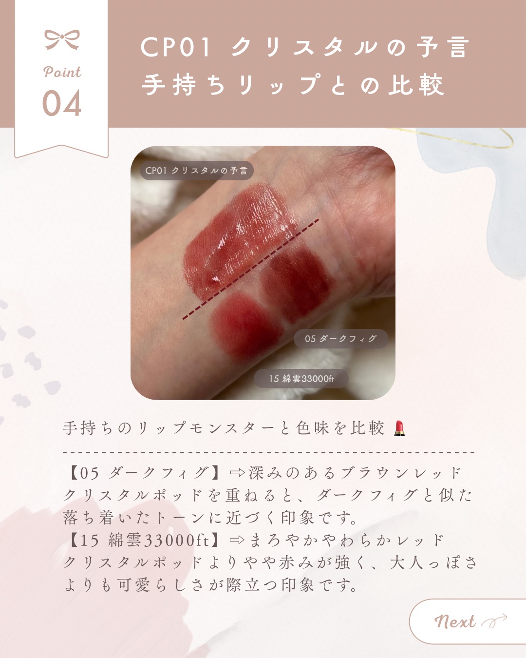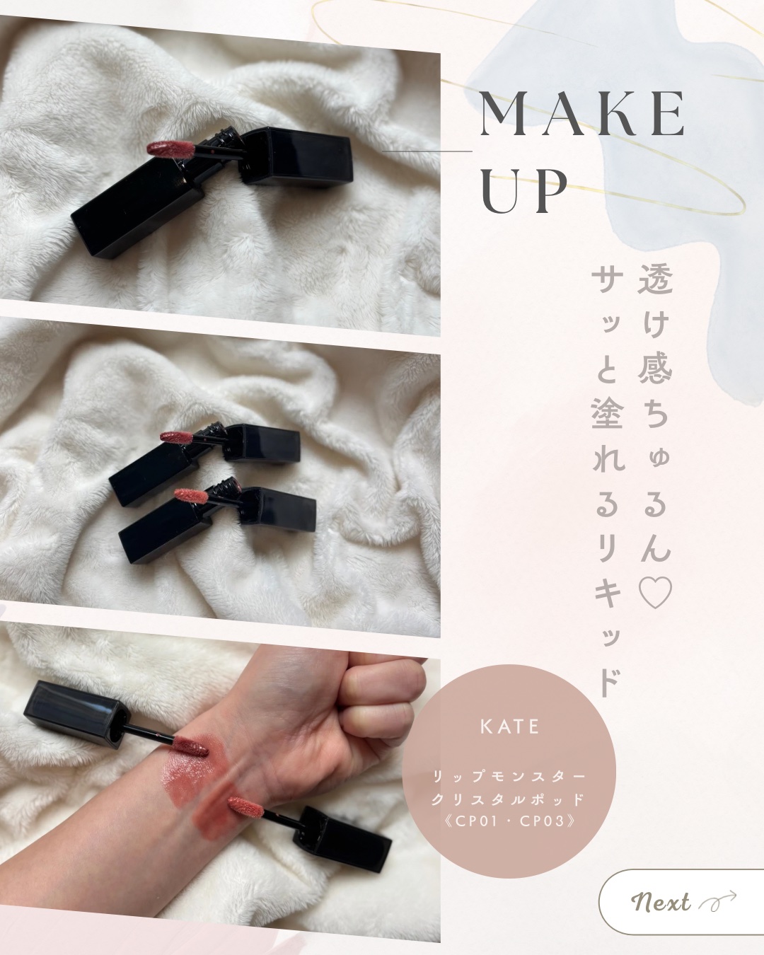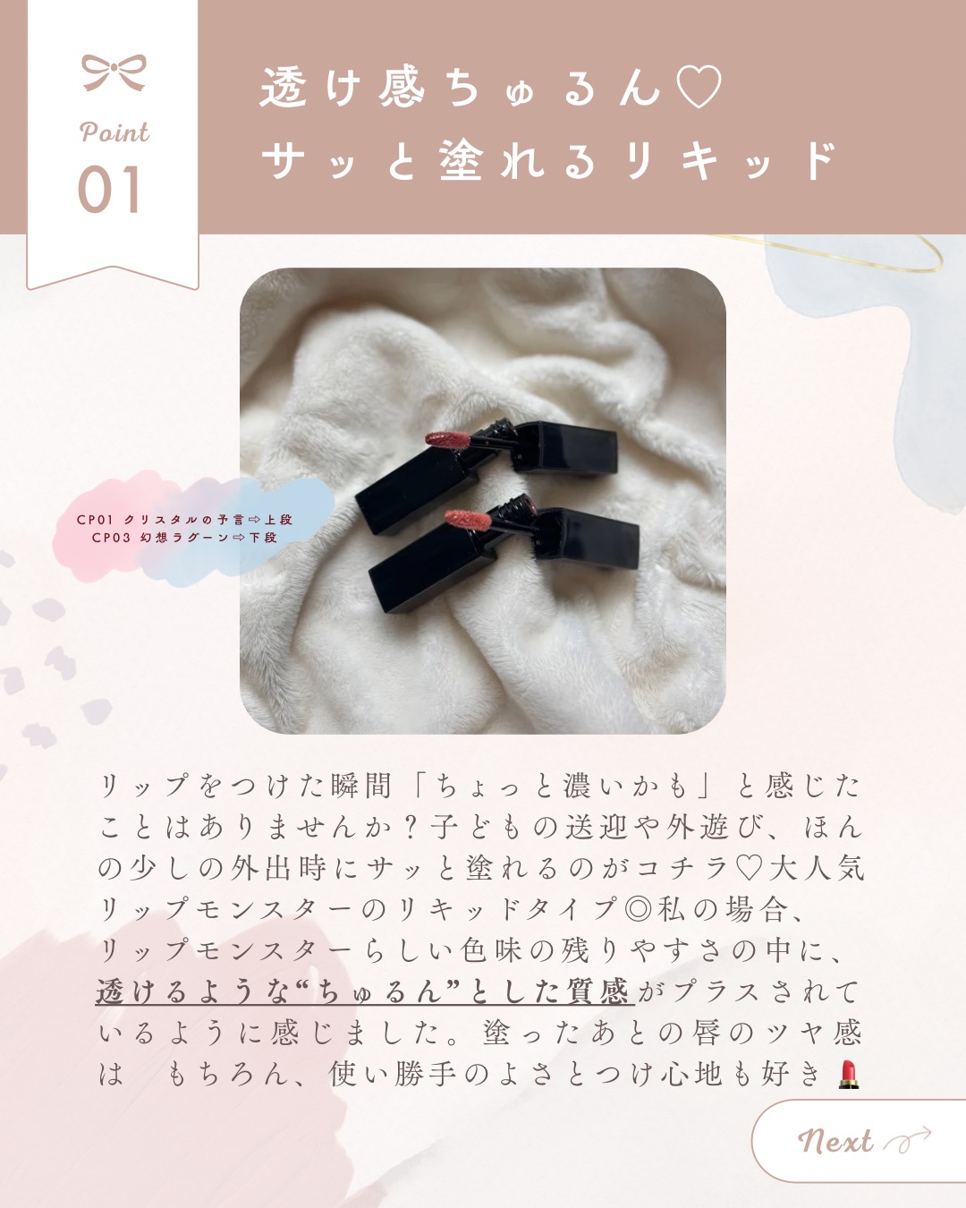 KATE様のプロモーションに参加しています💎リップモンスター クリスタルポッド💎10月25日新発売の新作リキッドリップ✨「リップモンスター」がリキッドタイプになって登場しました!今回は<色番>CP01【クリスタルの予言】、CP02【ピンクファ...