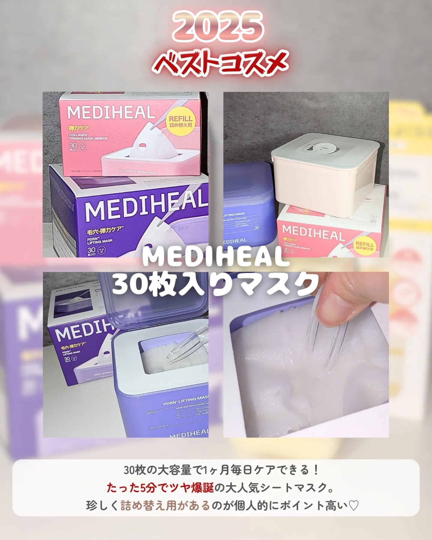 コスメリメイク様の2025年ベストコスメと2026年注目のネクストコスメをまとめてレビュー!メディヒール(@mediheal_jp)30枚マスクエッセンスがひったひたの30枚入り大容量マスク。シートの密着感がよく、デイリー使いしやすい!オング...