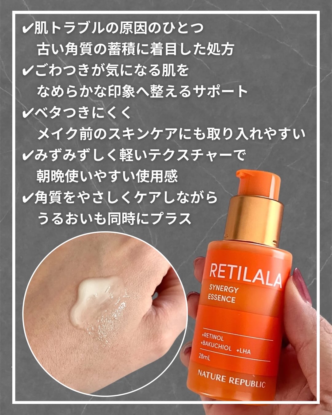NATUREREPUBLICレチララ美容液Xでも話題になってたレチララ美容液!肌トラブルの原因の1つである古い角質の蓄積に着目されていて、角質ケア&保湿のWケアが叶い、つるんとした印象の素肌へと導いてくれるそう!みずみずしいミルク状のテクスチ...