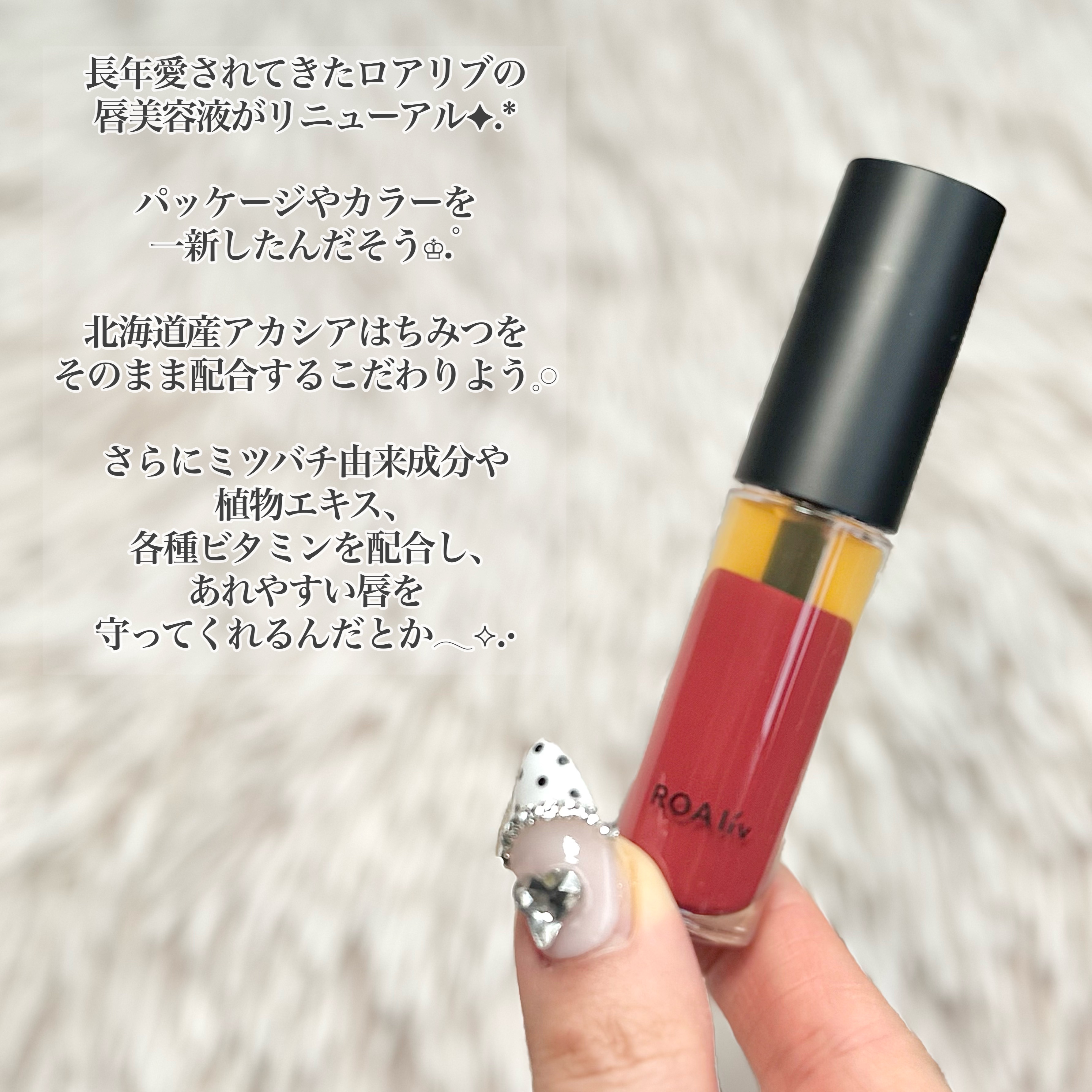 - 【包み込む、とろ蜜仕上げ。潤ってあれにくい、マルチユースな唇の美容液】 ロアリブを代表する唇の美容液・ハニーラスターが、モダンに進化を遂げます。唯一無二の処方 骨格や、はちみつのエキスでなく〝そのもの〟を配合するこだわりはそのままに、美容成分を強化。 ふっくらぷるんと潤って、縦ジワが気になる唇も、まるでスチームアイロンをあてたようになめらか な仕上がり。 ツヤを添える唇美容液が1種と、ケア層とカラー層が2層になったリップカラー美容液が6色。 1品でナチュラルなメイク&リップを楽しんでも、口紅に重ねてツヤをプラスするグロスとしても、口紅前に薄くなじませてリップ下地としてもお使いいただけます。 【はちみつのナチュラルな香り】 日中重ねるたびに気分がふんわりと柔らかくなるような、甘い香り。 [唇用美容液] ハニー [リップカラー美容液] ベルベットシュガー/ベイビー/バイラブ/リトルハグ/カシミヤ/デボーション