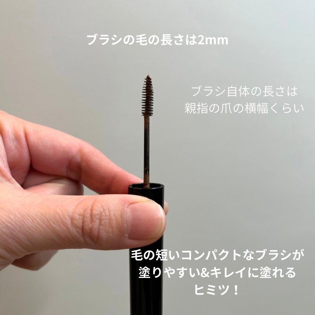 - 塗り残しゼロ!1本1本ムラなく仕上がる極細*ブラシの眉マスカラ ■コントロールしやすい極細*ブラシ 小回りが利いて1本1本ムラなくキレイに塗れる極細*ブラシを採用。 多様な毛質、生え方に対応し、塗り残しのない均一な仕上がりを叶えます。 ■地肌に付きにくいブラシ設計 眉毛1本1本の根元からキレイに色づくのに、地肌に付きにくいコンパクトなブラシ設計で、眉尻や、眉毛が密集する眉頭も、ムラ・束感なく塗ることができます。 ■高発色なのに薄膜仕上げ!眉色を1トーンUP 高発色で眉毛の黒色をしっかりカバーするのに薄膜に仕上がり、1トーンUPした眉色であかぬけた印象を演出します。 ■長時間落ちにくいのに、お湯で簡単オフ 汗・水・皮脂・こすれに強く、長時間落ちにくい処方です。 フィルムタイプなので、ぬるま湯でスルッと簡単に落とせます。 ■美容液成分パンテノール(眉毛保護成分)配合 水溶性ビタミンのパンテノール(眉毛保護成分)が眉毛をやさしくケアし、眉毛にツヤ・ハリを与えます。 *ヘビーローテーション内