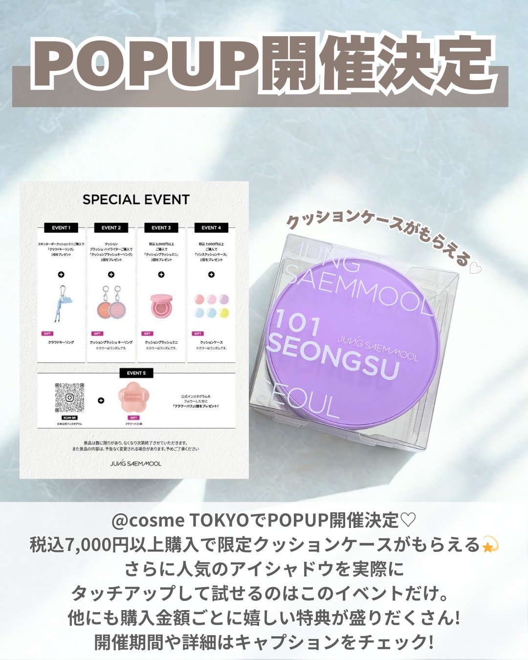 \アットコスメTOKYOにてジョンセンムルがPOPUPするよ/POPUP限定で7,000円(税込)以上の購入者にクッションファンデのケースがもらえたり、アイシャドウがお試しできたりするからぜひチェックしてみてねー!🎀✨ジョンセンムルといえば有...