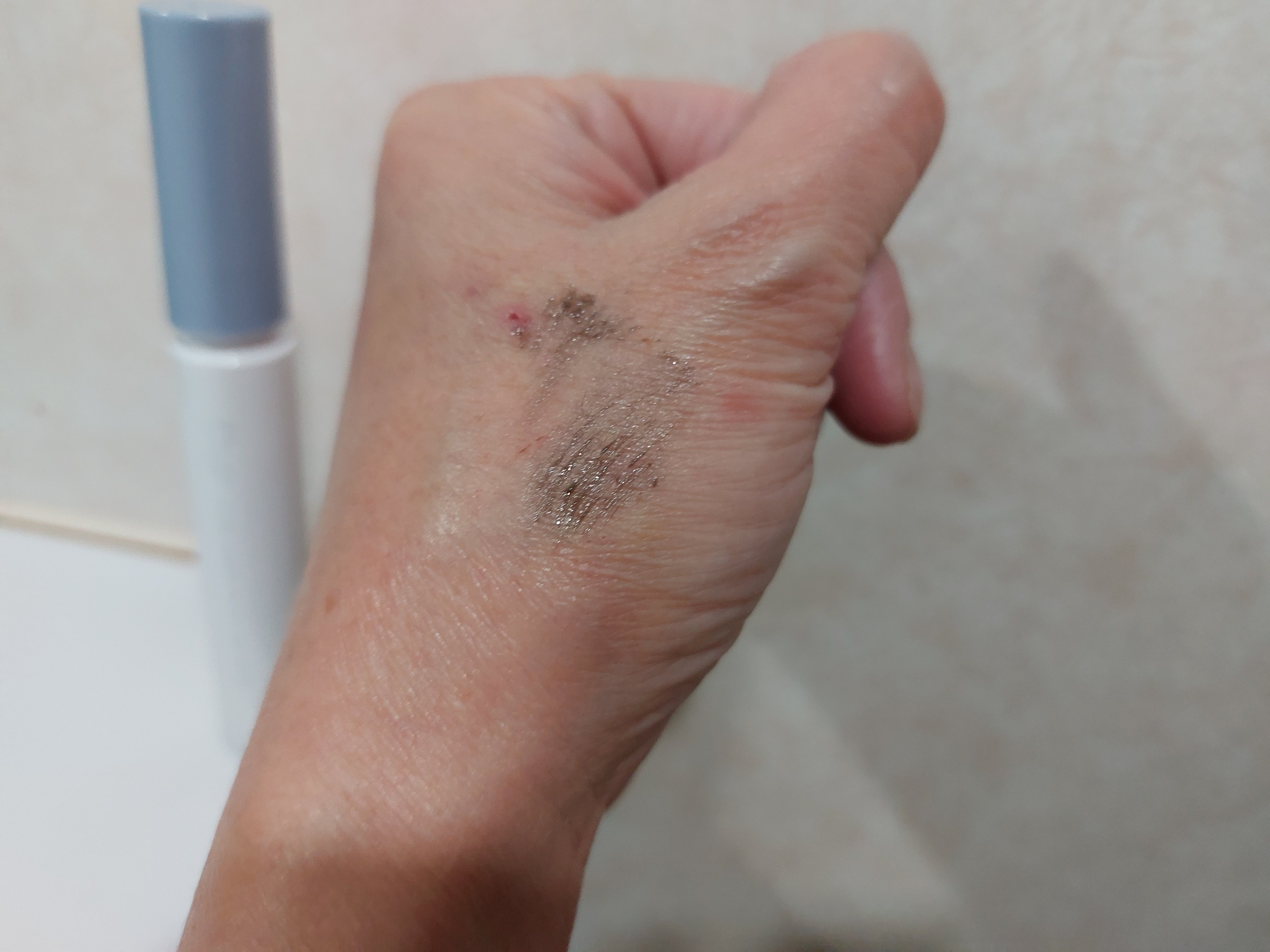 もちっとしたジェリーテクスチャーは、しっとりとした質感で粉っぽくないので指塗りしやすく、ポイントカラーも重ねやすい。 左のベースカラーは淡めの発色。 右のポイントカラーは見ためほど濃くならずにこちらも淡め。