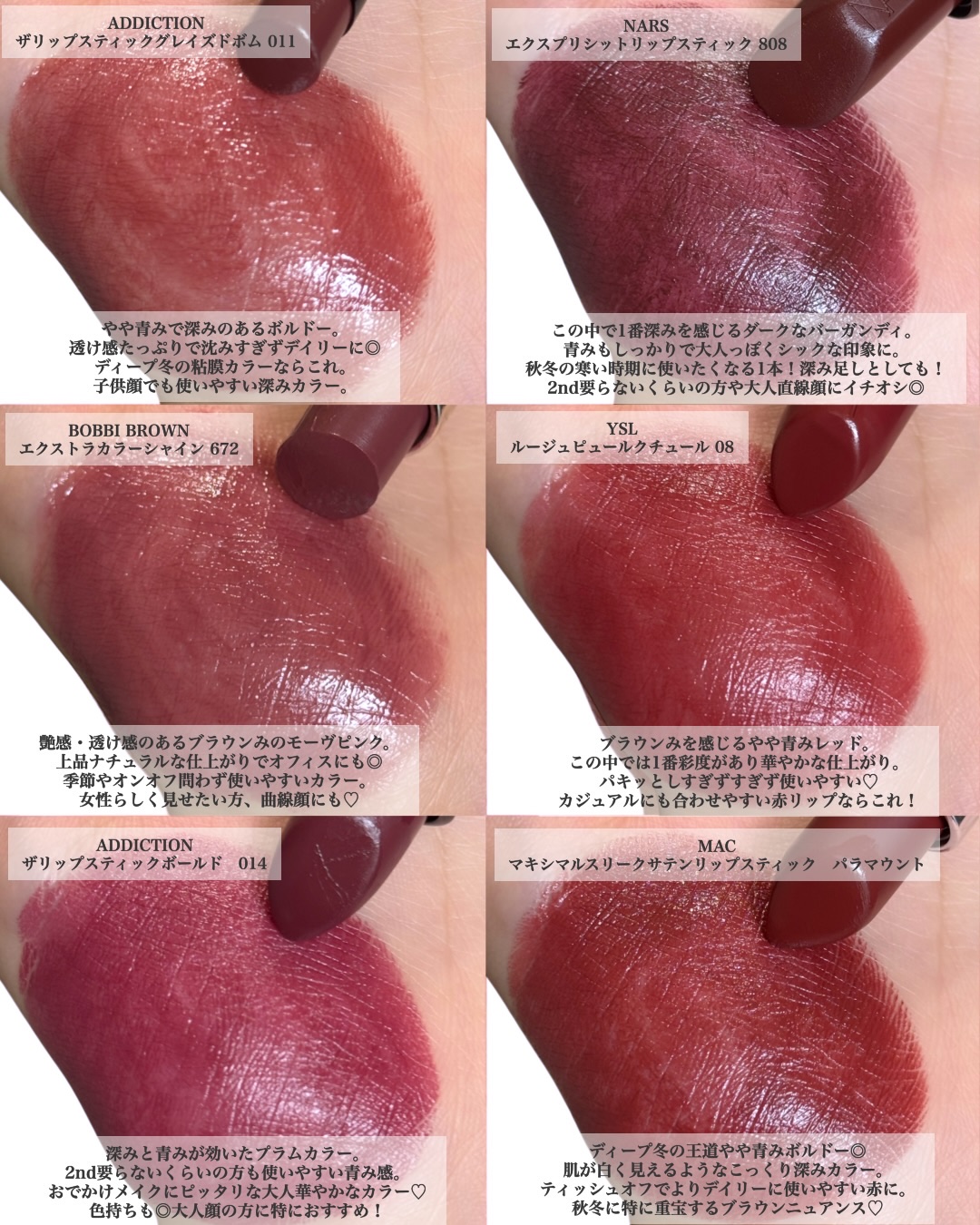 特に ディープウィンター におすすめしたい 【デパコスリップ】をまとめました🥀⛓️ 黒を足したような深みを感じる色がお得意🖤 唇の上で明るく発色してしまう場合は手の甲に色をのせた際に「暗すぎない?」と感じるくらいのものが案外唇の上ではベストだったりします。