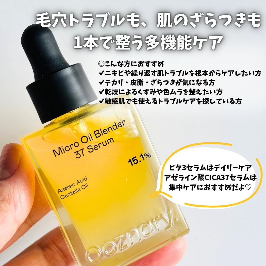 💛Ooznaryアゼライン酸CICA37セラム⊹࣪˖┈┈˖࣪⊹┈┈⊹࣪˖┈┈˖࣪⊹┈┈⊹࣪˖┈┈˖࣪⊹皮脂もくすみ※も、アゼライン酸で「まるごとリセット」 ※乾燥による攻めずに、整えるゆらぎ肌の新ルール✨毛穴トラブルも、肌のざらつきも、1本で...