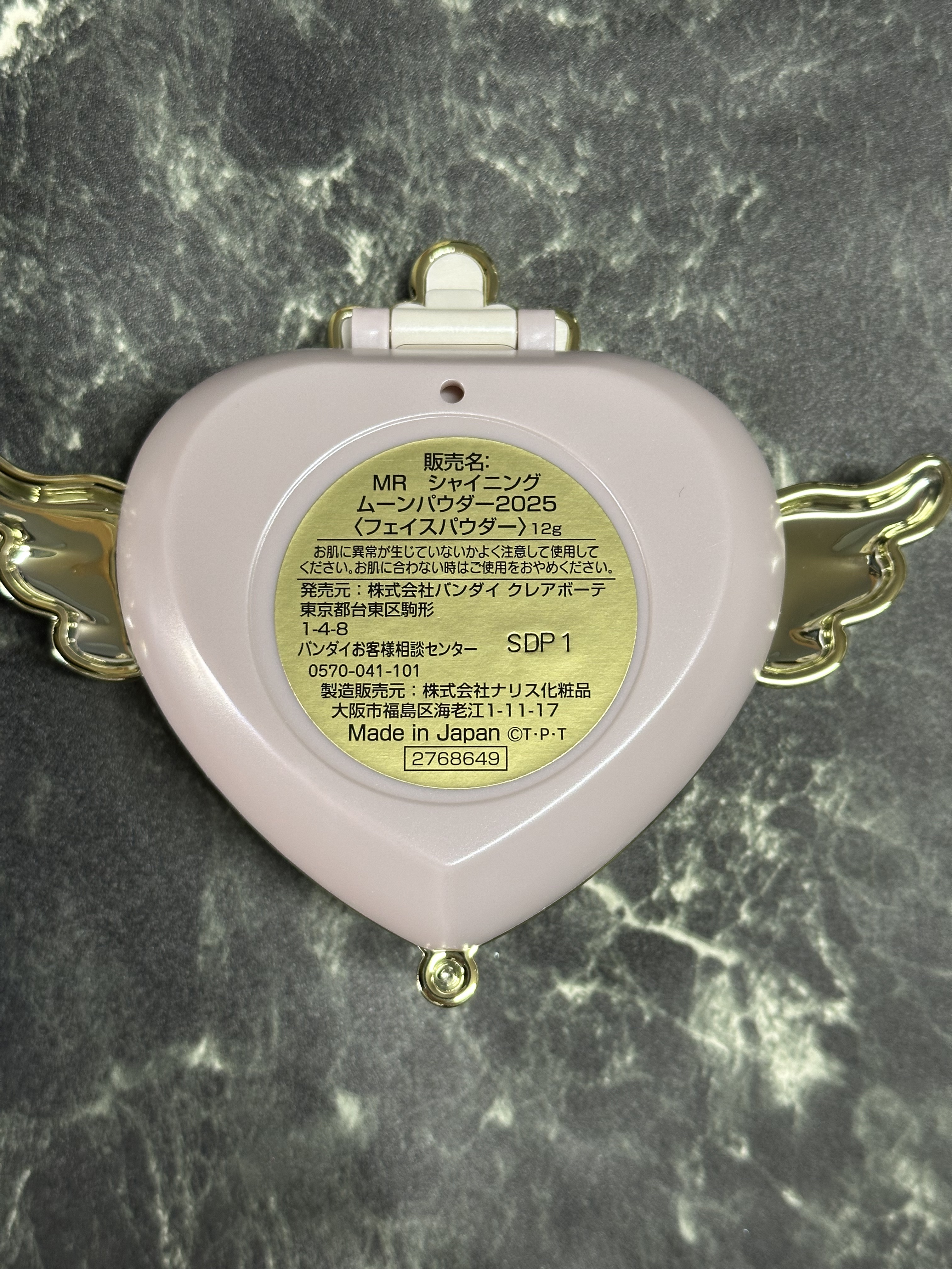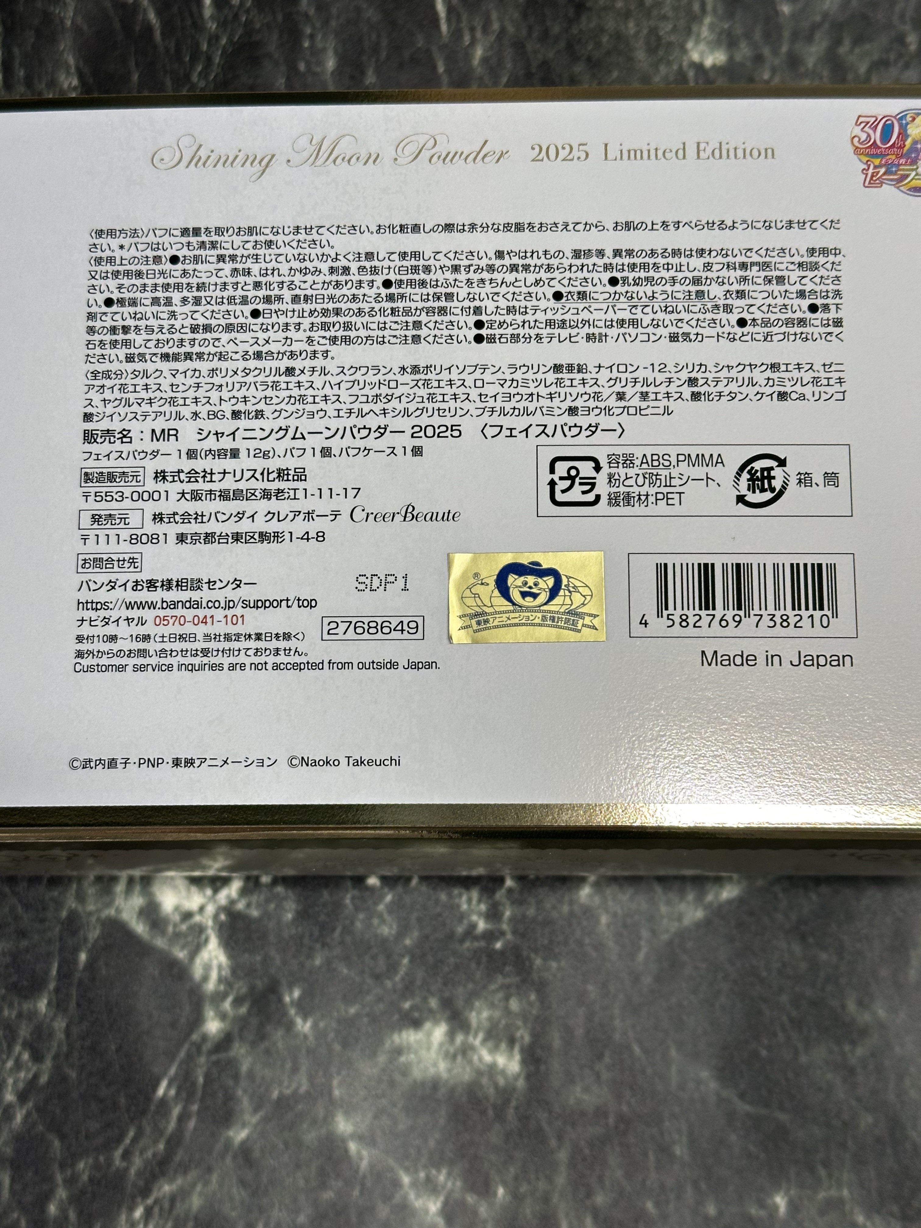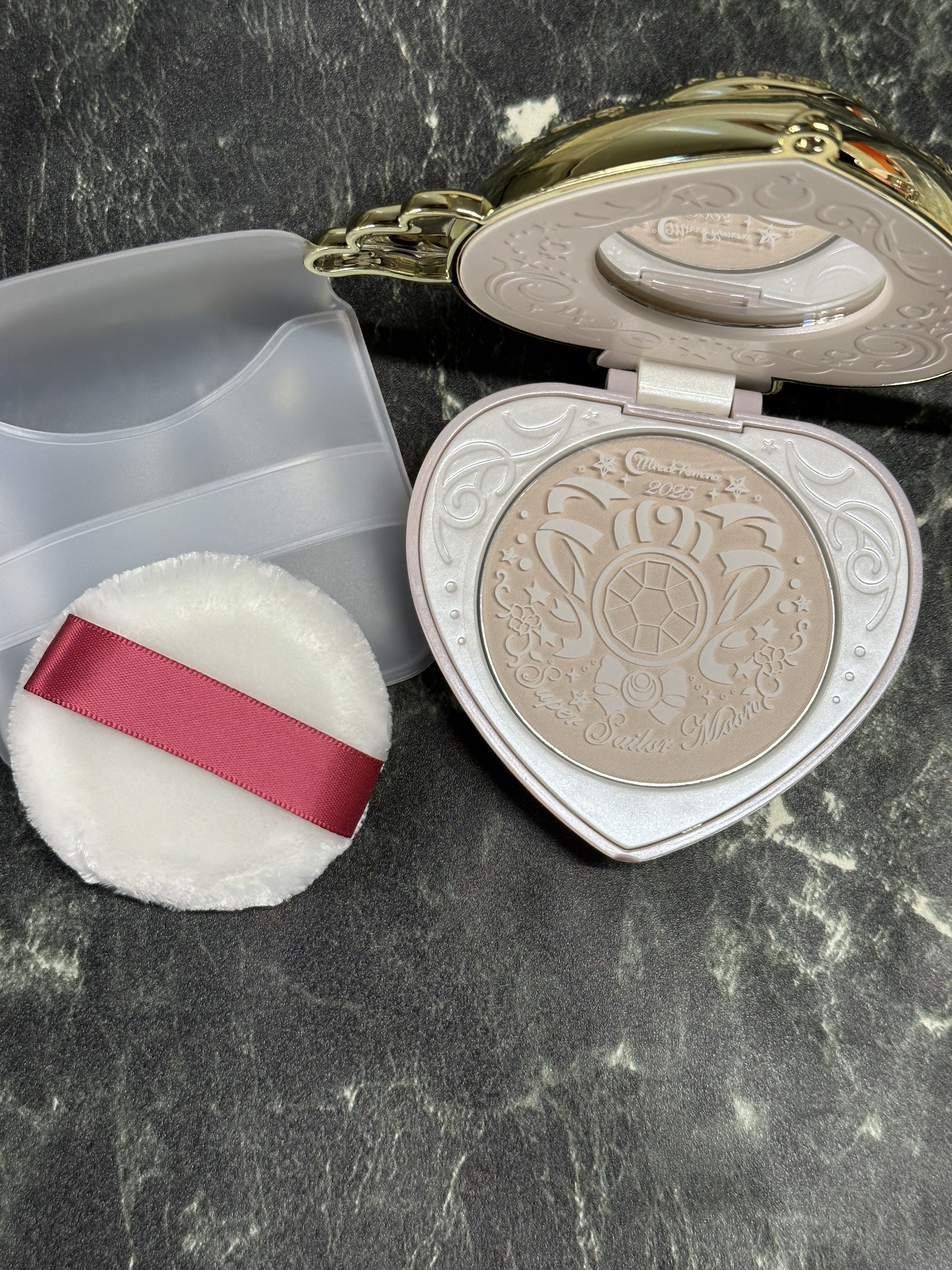 - 2018年から始まった「シャイニングムーンパウダー」シリーズは好評につき今年で7作目。今作はシリーズ初となる「クライシスムーンコンパクト」をモチーフに、クレマチスの花と羽を細やかにあしらったデザインです。中央の石にはキュービックジルコニアを使用、シルバーゴールドメッキと共に上品に輝き、クリアパーツの内側からは万華鏡のようなホログラムがきらめきます。 コンパクト中央下には、「2025」の刻印が入っています。 コンパクト内側にも曲線的なモチーフとセーラー5戦士の守護星マークをあしらい、コンパクトを開くたび、繊細で美しい刻印が目に入ります。 パウダーは、どなたでも使いやすいクリアカラーフィニッシュパウダーを採用。ソフトフォーカス効果のある球状パウダー(※1)配合で、ヴェールをまとったような自然に美しい肌へ導きます。板状粉体(※2)と球状粉体(※3)を組み合わせたパウダーは、なめらかな塗り心地ながら、ぴたっとした密着感をかなえます。厳選した美容成分5種(※4)を配合したこだわりの仕様です。 ※1…シリカ(基剤) ※2…タルク、マイカ(基剤) ※3…ポリメタクリル酸メチル(基剤) ※4…シャクヤク根エキス、ゼニアオイ花エキス、センチフォリアバラ花エキス、ローマカミツレ花エキス、ハイブリッドローズ花エキス ※いずれも整肌成分