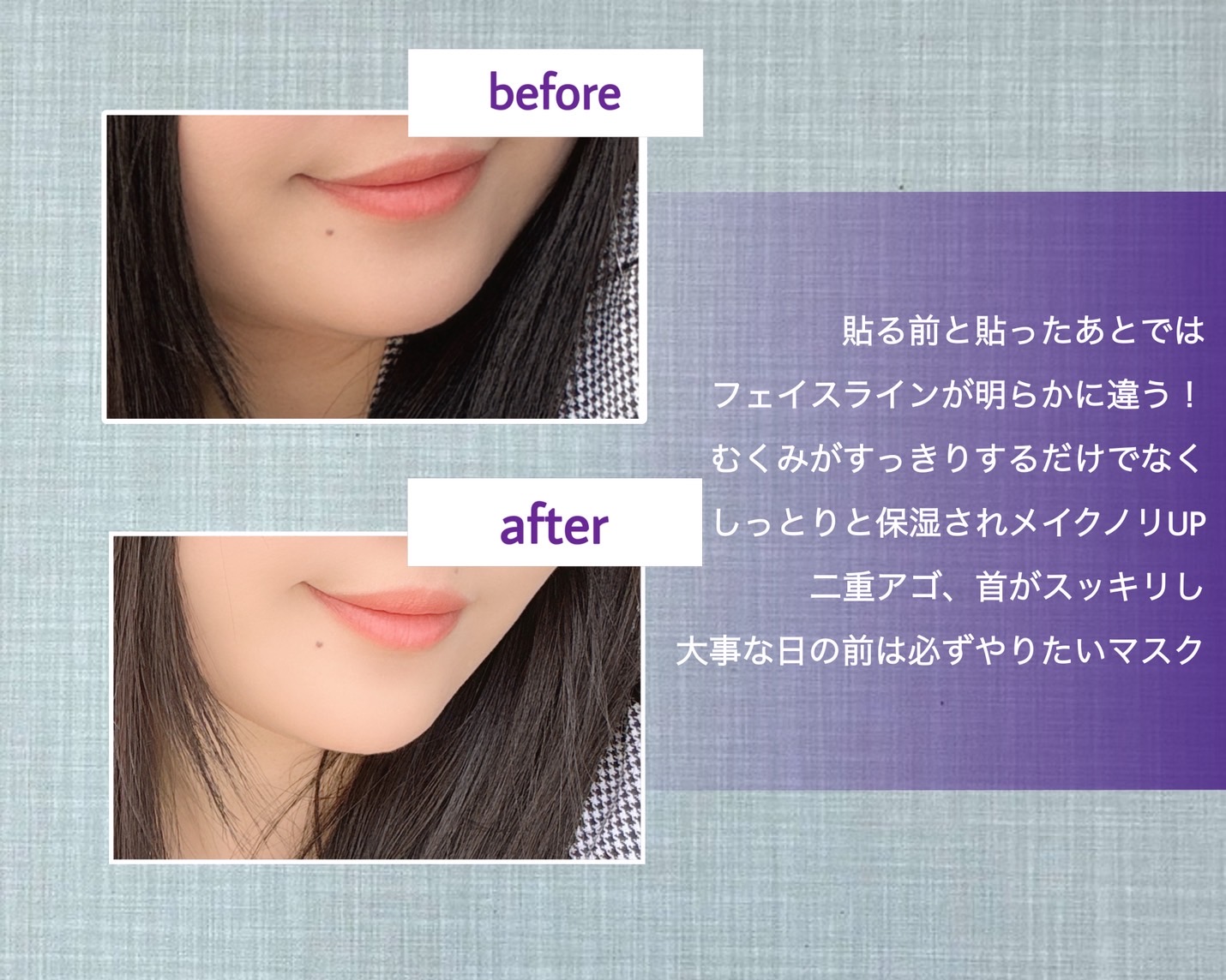 - ※2025年7月以降、商品パッケージ順次リニューアル。尚、これにかかる商品の返品・交換は承っておりません。 上下セパレートタイプの立体密着、マスクでぐいっと引き上げ*1! NMN*2バイオ圧縮カプセルと糸が溶け込んだ弾性3Dシートマスク *1使用方法のこと *2ニコチンアミドモノヌクレオチド(整肌成分) (※2025年3月下旬より全国のバラエティーショップで順次発売開始予定。)