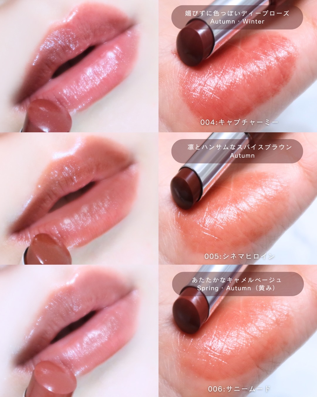 色もちも良くって乾燥しにくいから文句のつけどころがない。 ☑︎201 Miro粘膜ピンクレッド→イエベ春・ブルベ夏 ☑︎203 Markじゅんわり多幸感コーラル→イエベ春 ☑︎204 Haveピュアなベイビーピンク→イエベ春・ブルベ夏(明るめ得意) ☑︎207 Depthレディな透けプラムレッド→ブルベ冬のデイリーブルベ夏の華やか ☑︎208 Poshニュートラルなレッド→ブルベ冬・イエベ春秋(鮮やか得意) ☑︎209 Near落ちついた洒落感オレンジ→イエベ春・イエベ秋(黄み得意) ☑︎213 Jeffブラウンが溶け込んだローズイエベ秋(2ndブルベ夏) ☑︎215 Lennaクリアで可憐な青みピンクブルベ夏冬(明るめ得意) ☑︎216 Winterディープなプラムレッドブルベ冬(青み得意)