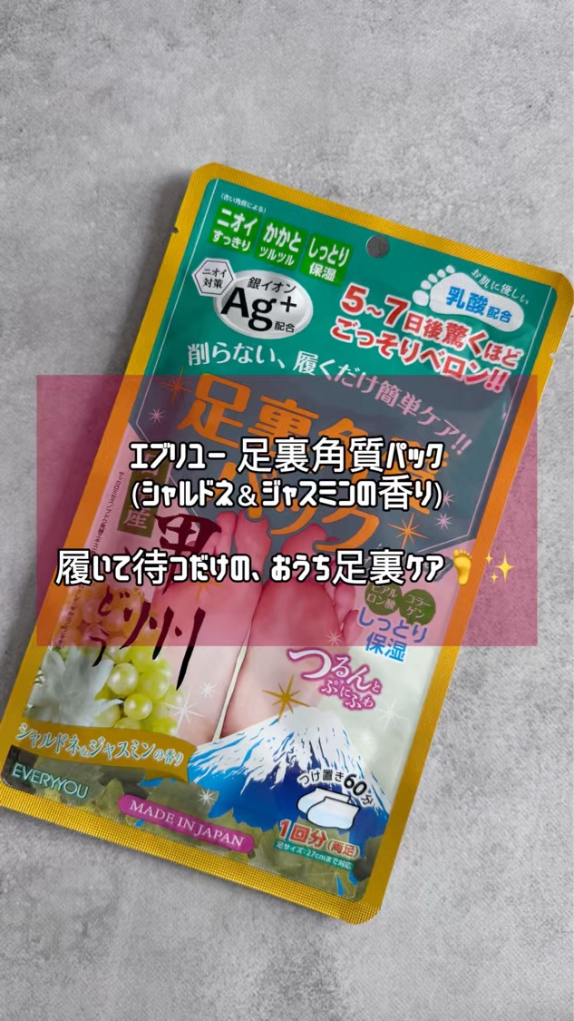 古くなった角質をケアする足裏角質パック1回分(両足)。パックになっていて、乳酸に1時間ほど浸して、数日かけて優しく足の角質オフできます。 銀イオンAG+で雑菌の繁殖を抑えて抗菌、保湿成分でしっとりケア。グリコール酸不使用だからお肌にも優しいので、刺激とかも感じなくて、使いやすいかと思う。
