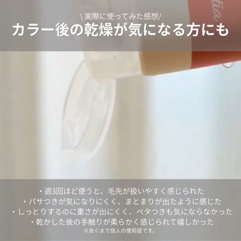| トリートメントランキング第65位 | 洗い流した瞬間わかる 「ちゅるん!!」感。 まとまりのある髪になり 「毛量減った!??」と勘違いするくらい。 | 詳細を見る | ||
