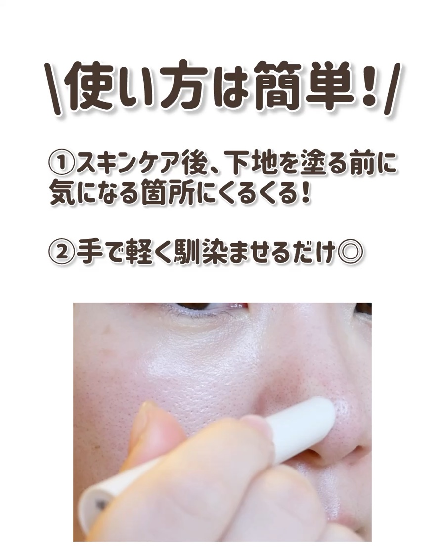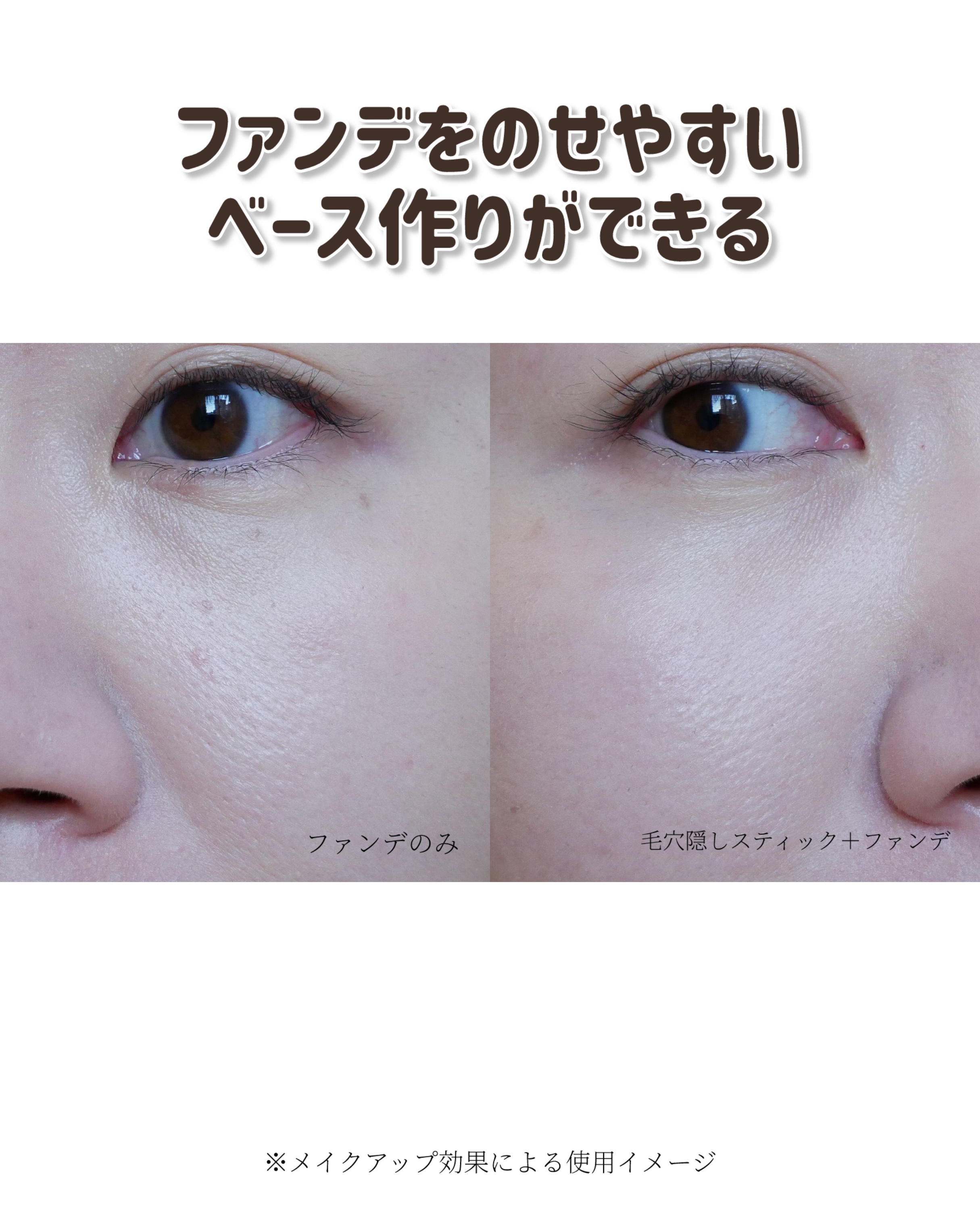 - 気になる凸凹毛穴、つるさらカバー まるで塗る毛穴消しゴム※1!毛穴隠し特化型 部分用下地 ① 凸凹毛穴をぼかしてフラット仕上げ 徹底!毛穴隠し処方「毛穴フラット効果」を採用。 塗る毛穴消しゴム※1 のように、ひと塗りで瞬間毛穴レス※1 を叶えます。 ② 毛穴落ち&テカりを徹底ブロック スピーディーオイルロックパウダー※4 が皮脂を素早く固めます。 毛穴を隠しながら毛穴落ちも防ぎ、1 日中毛穴レス※1 な肌に。 ③ 毛穴を隠しながら同時にスキンケア キメを整え、お肌をひきしめるスキンケア成分配合。 ④ 使いやすいスティックタイプ ピンポイントに直塗りできる「スティックタイプ」。 テクニックいらずで瞬時に毛穴レス肌に。 ●ニキビのもとになりにくい処方 ノンコメドジェニックテスト済み。 ※すべての方にニキビのもとができないわけではありません。 ※1 メイクアップ効果による ※4 オクテニルコハク酸デンプン Al、酸化亜鉛、ジメチコン