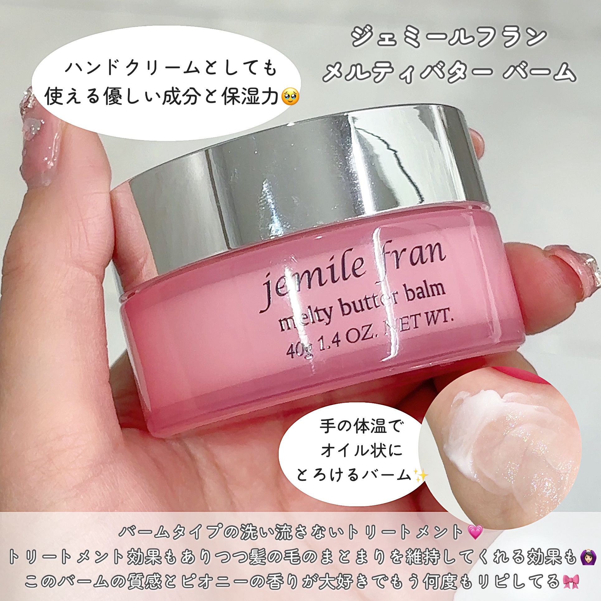 | ヘアケア・スタイリングランキング第185位 | 指の腹でとれるくらい、とろけやすいバーム。艶感がでて、まとまる😍 | 詳細を見る | |