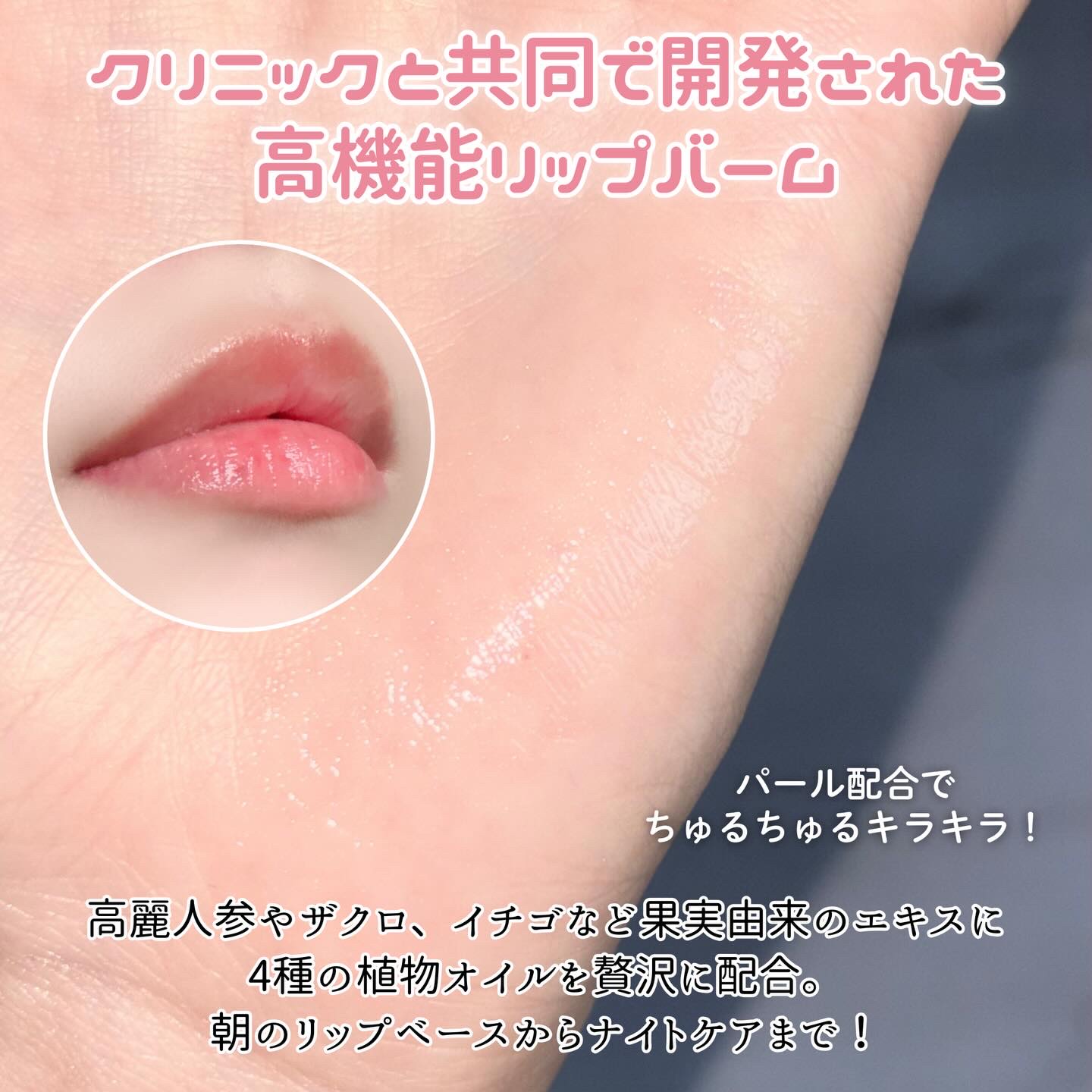 - ・唇に潤いチャージしながら、立体唇も演出する優れもの クリニックとの共同開発により生まれた新商品「バランシングリップバーム」は、高麗人参やざくろ、イチゴ等のエキスとマカダミアオイル、オリーブオイル、ローズヒップオイル等の保湿成分がたっぷり含まれているので、唇の皮むけや乾燥、縦ジワなどのお悩みをケアし、健康的な唇へと導きます。 また、ピンクパール配合で唇の立体感もアップ。唇が立体的に見えると顔全体が引き締まった印象となり、小顔効果にも繋がります。 こっくりとしたテクスチャーが唇に密着し、保湿力は高いのにべたつかない使用感もこだわりの一つです。寝る前の唇ケアはもちろん、リップメイクのベースに使うことでリップのノリも良くなります。