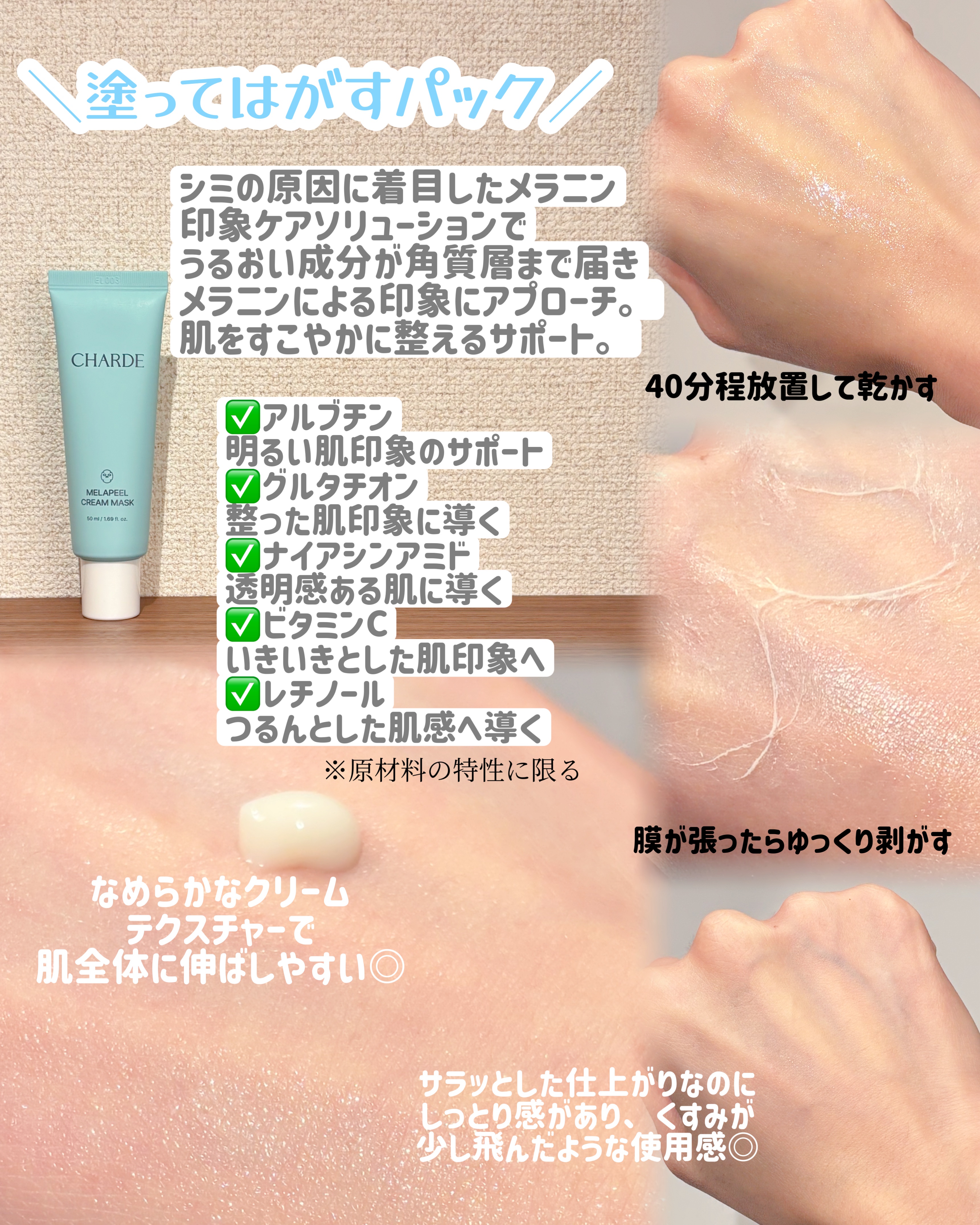 #CHARDE@charde_jp「メラピールクリームマスク」 塗って乾かして“ぺりっ”と剥がすだけ。 くすみ・シミ悩みに使う人が多い、話題のピールオフマスク。広告で見てから気になってたメラピール✨アルブチン、グルタチオン、ナイアシンアミド、...