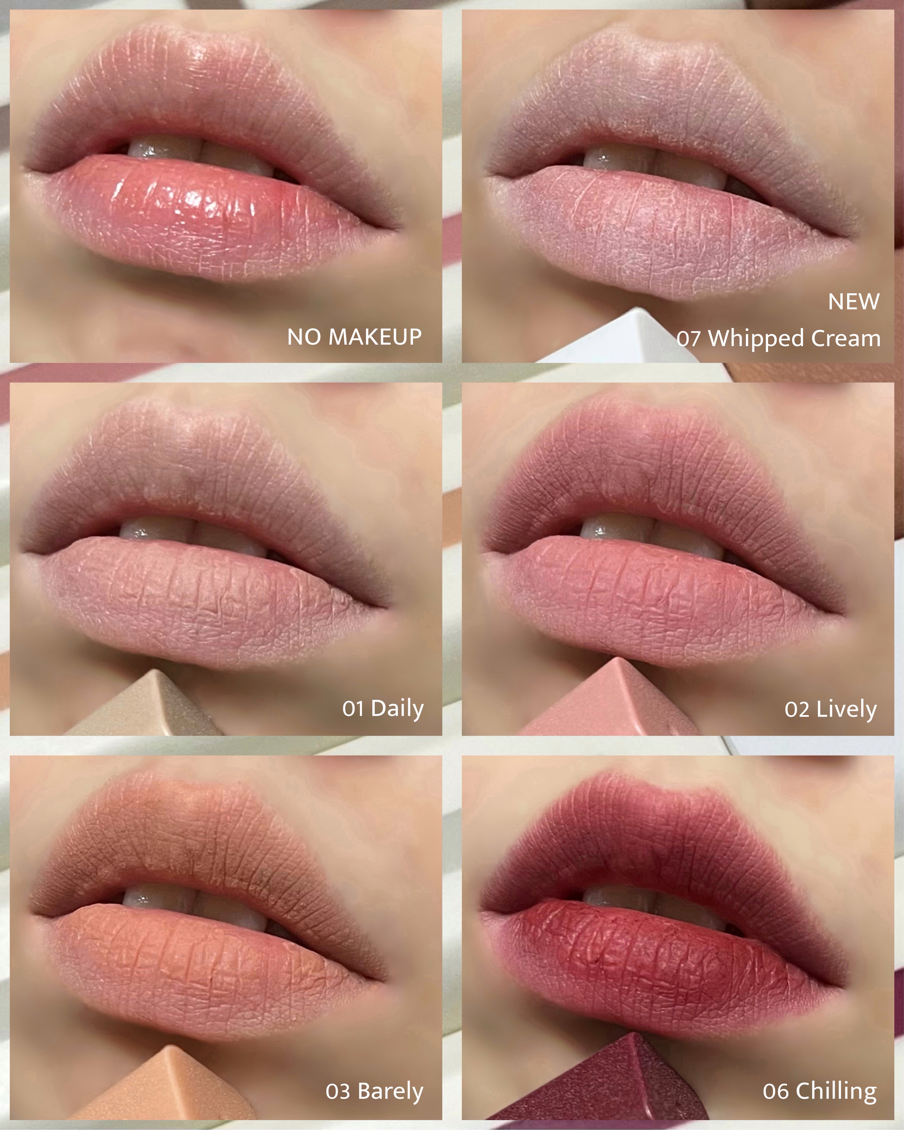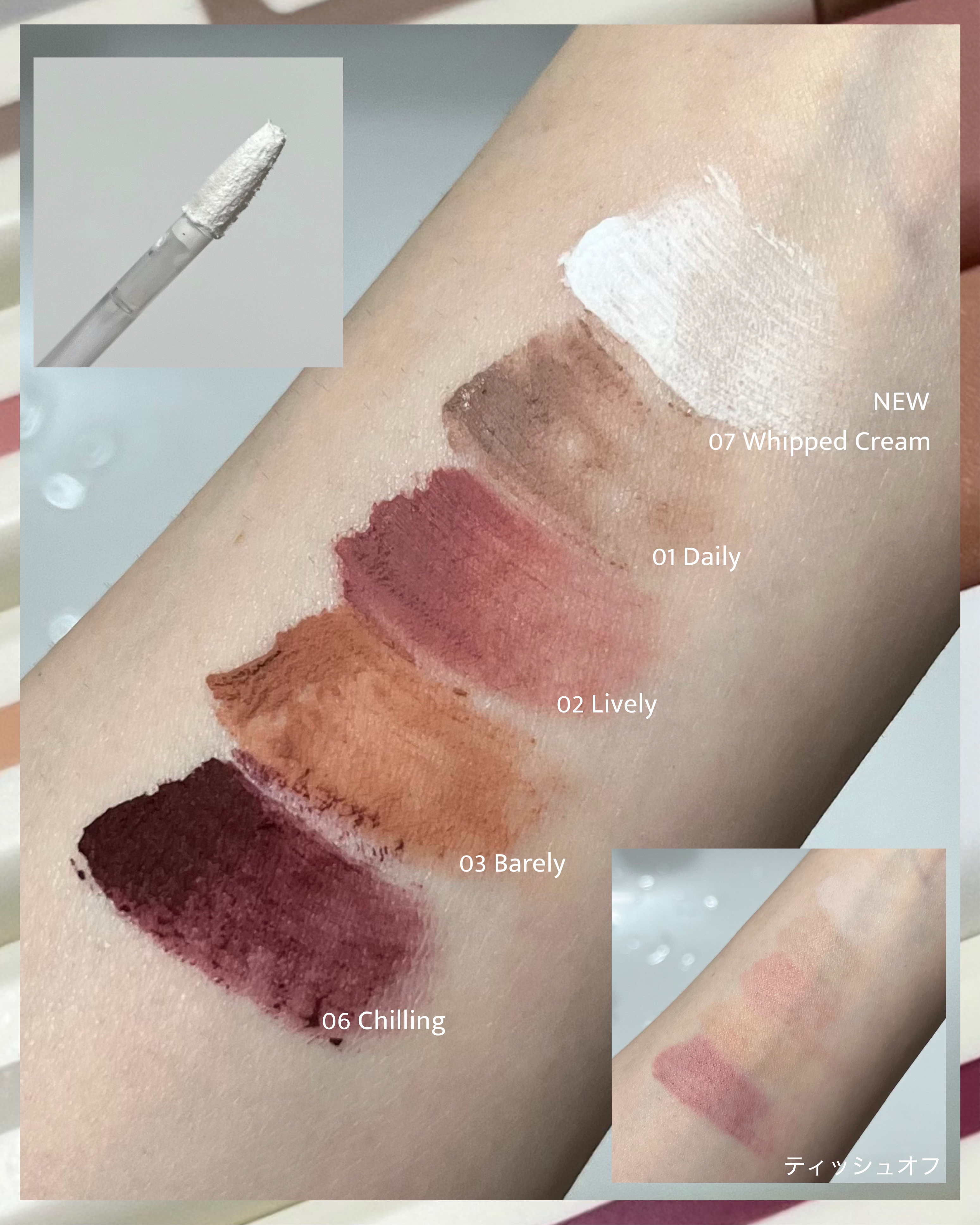 SNSで話題沸騰中のA.chiからブラーティントの新カラー【WhippedCream】が1/30(金)にローンチされるよ!新色の07は鮮やかすぎたり、派手なリップカラーを優しく中和してミルキーな感じにチェンジできます!◾︎5対5とか、色を組み...