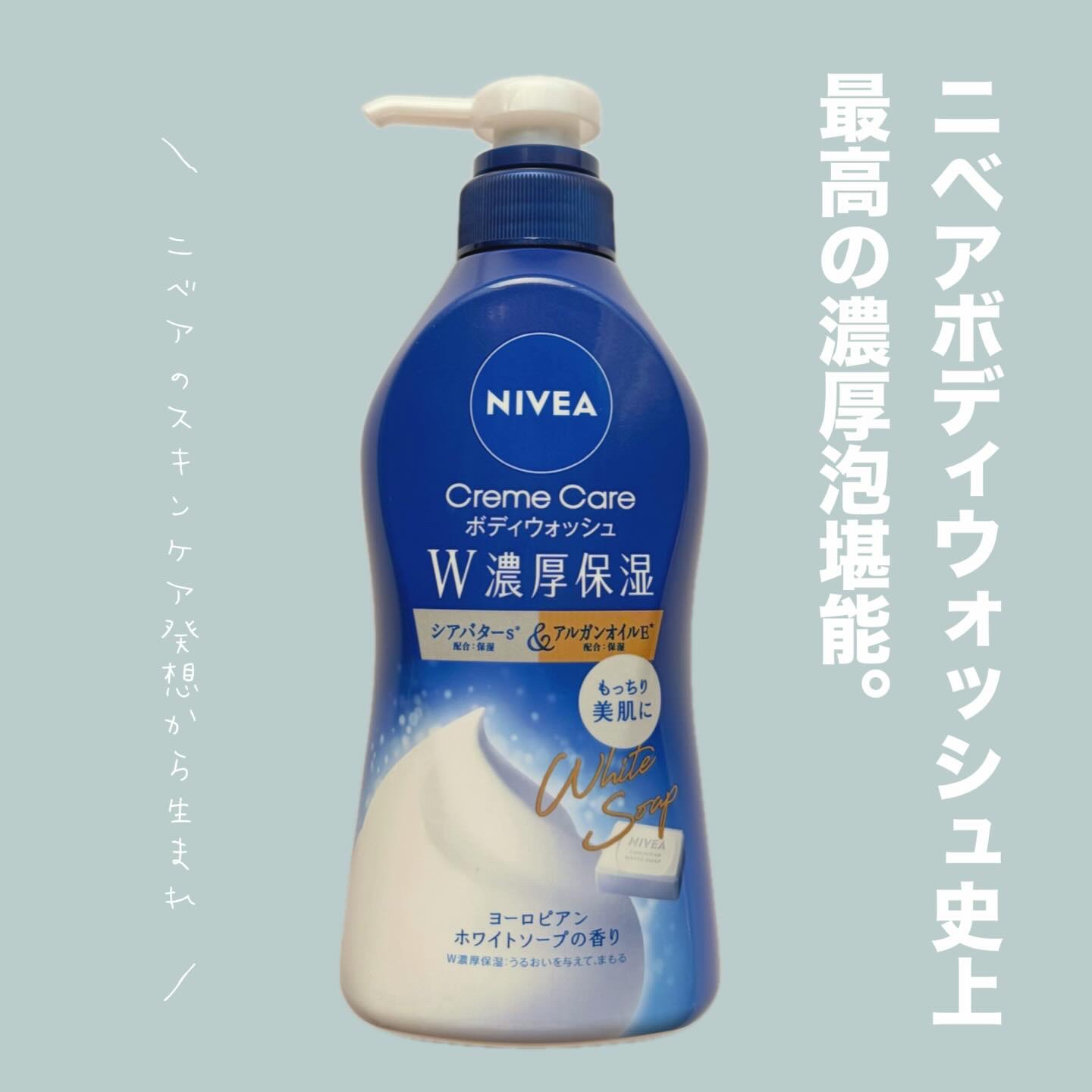 - うるおいを与えてまもるW濃厚保湿ボディウォッシュ クリームのような濃厚泡でもっちりやわらかな美肌に 上質なせっけんの香りでやすらぎ感のある、ヨーロピアンホワイトソープの香り。 ●ニベアのスキンケア発想から生まれた、うるおいを与えてまもるW濃厚保湿処方のボディウォッシュ。シアバターs(*1)&アルガンオイルE(*2)配合。 ◇シアバター 「保湿の王様」とも呼ばれ、高い保湿力で肌を乾燥から守る性質があるとされています。 ◇アルガンオイル サラッとした感触のオイルで、閉そく性により皮ふの水分蒸発を抑え、肌の柔らかさを保つ性質があるとされています。 ●クリームのような濃厚泡が肌をやさしい使い心地で洗いあげ、リッチにうるおい、もっちりやわらかな美肌に。 (液体で出るタイプ) (*1) シアバター・グリセリン(保湿) (*2) アルガニアスピノサ核油・グリセリン(保湿)