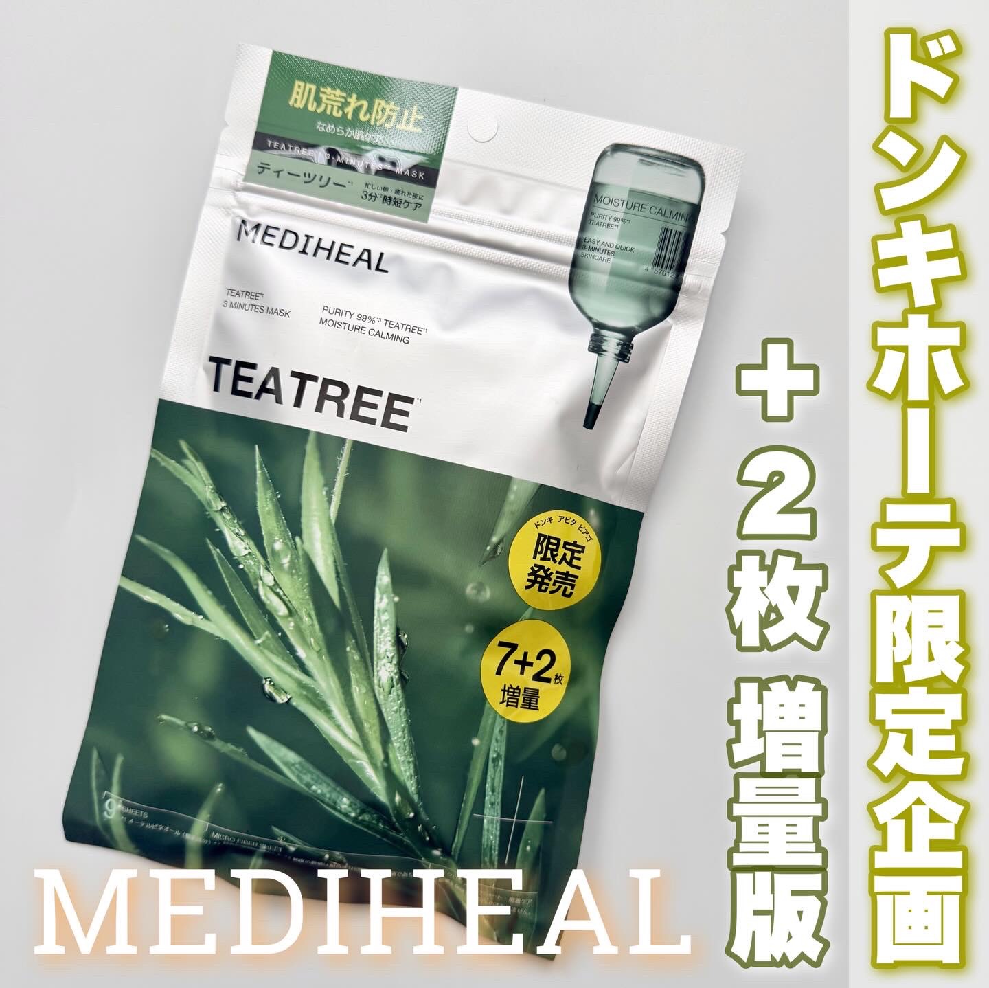 忙しい日の心強い味方🌿MEDIHEALティーツリー3ミニッツマスクドン・キホーテ限定の増量企画が登場。通常よりうれしい9枚入りで毎日使いしやすいのがポイント😎たった3分のケアでも肌にうるおいをしっかり届けてくれる使用感が魅力だよ❤️ティーツリ...