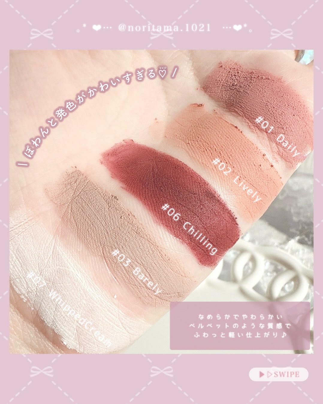 A.chiから可能性無限大✨ふんわりやわらかなホワイトリップ登場☁️🤍✦A.chiブラーティント07WhippedCream🆕01Daily02Lively03Barely06Chilling今回の新色はホワイト!どんなカラーとも相性がよく鮮...